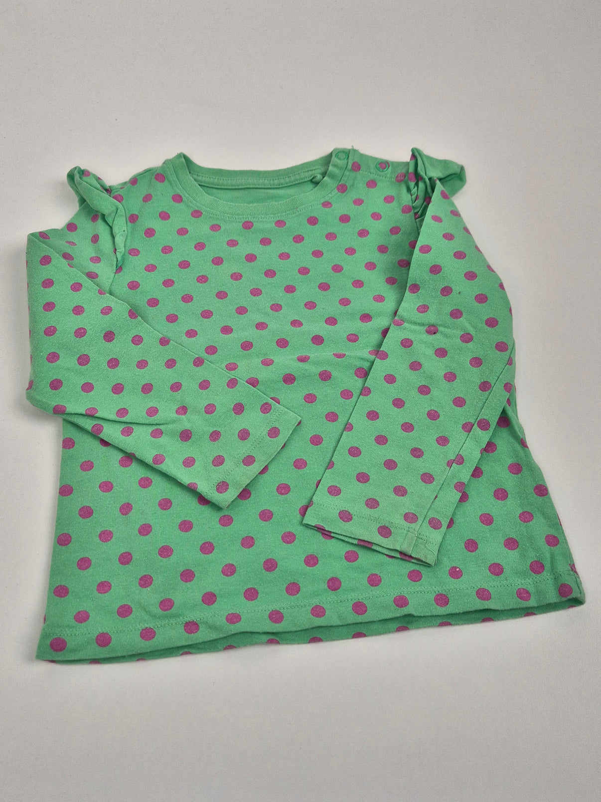 Veselé dívčí tričko v krásné mátově zelené barvě s růžovými puntíky je skvělým parťákem na každodenní nošení. Díky dlouhým rukávům a jemné bavlněné látce je ideální do školky, na doma i na ven v chladnějších dnech. Ramínka zdobí malé volánky, které dodávají tričku roztomilý dívčí vzhled.