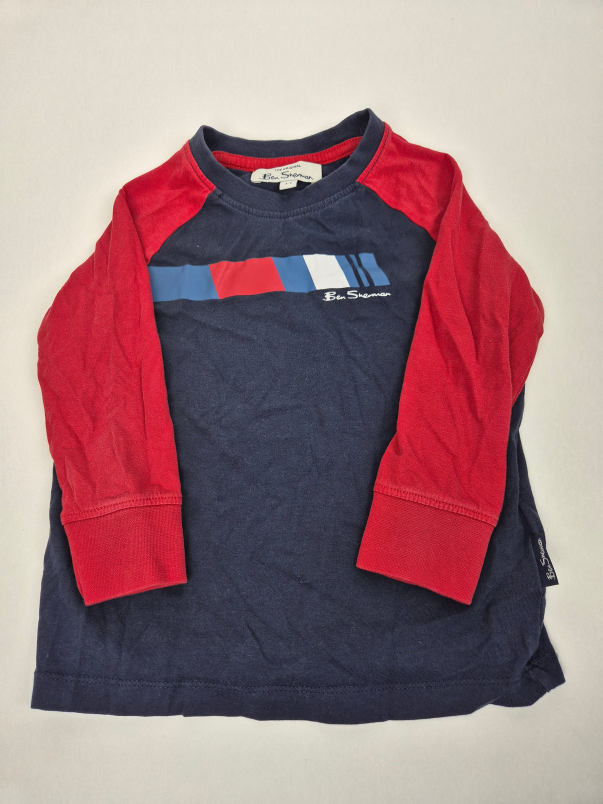 Pohodlné tričko s dlouhým rukávem Ben Sherman v moderní kombinaci tmavě modrého základu a výrazných červených rukávů. Na hrudi má sportovní grafiku v odstínech modré, červené a bílé společně s decentním logem značky. Příjemný bavlněný materiál je ideální na každodenní nošení – skvělé hlavně pro kluka, ale sedne i malému sportovně laděnému obojetnému outfitu.