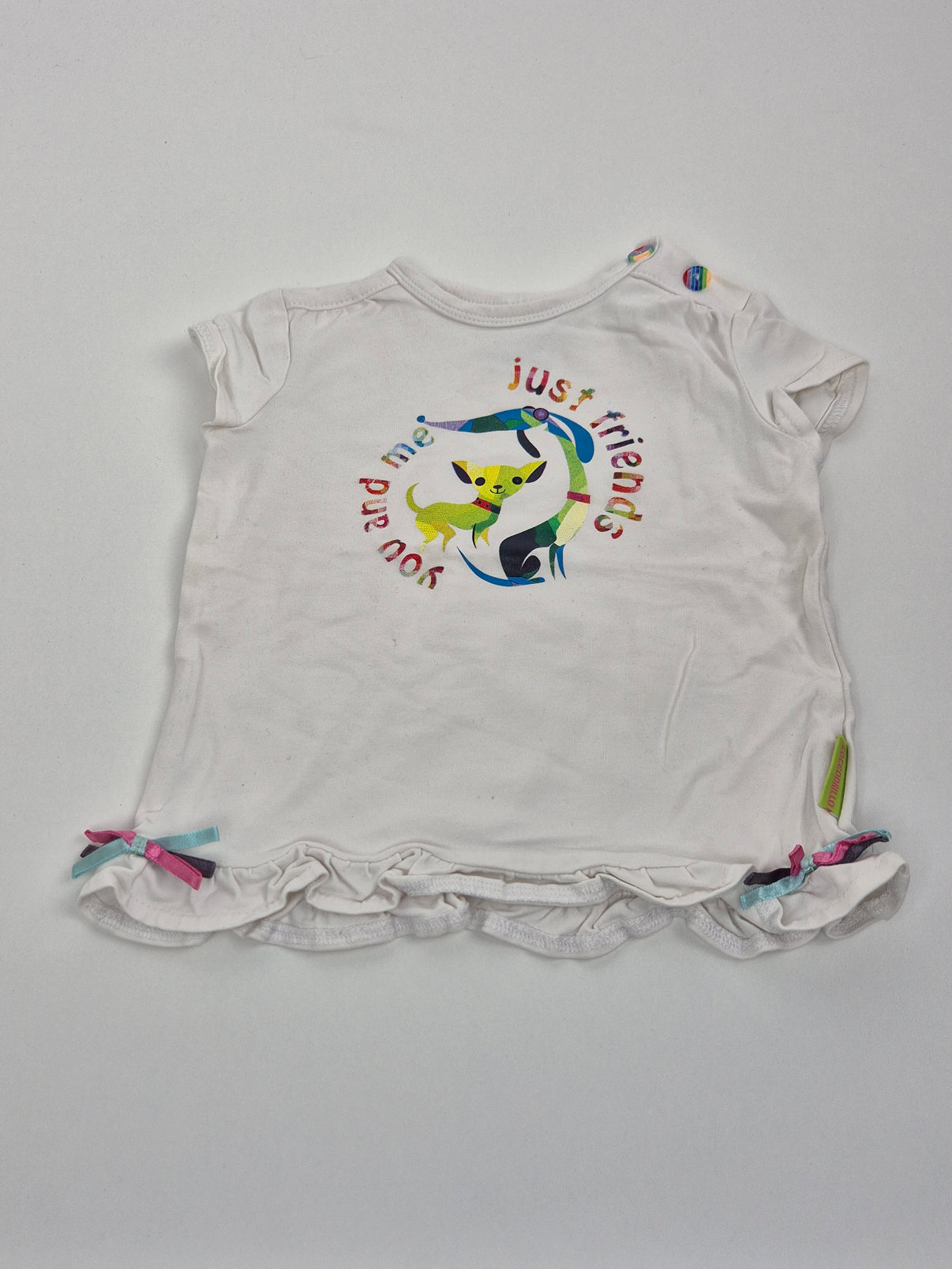 Roztomilé dívčí tričko Coccodrillo ve velikosti 80 v jemné bílé barvě. Přední stranu zdobí barevný potisk se zvířátkem a nápisem just friends – you and me, který působí hravě a veselě. Na ramenou jsou praktické cvočky pro snadné oblékání a spodní lem má jemné řasení ozdobené malými saténovými mašličkami.