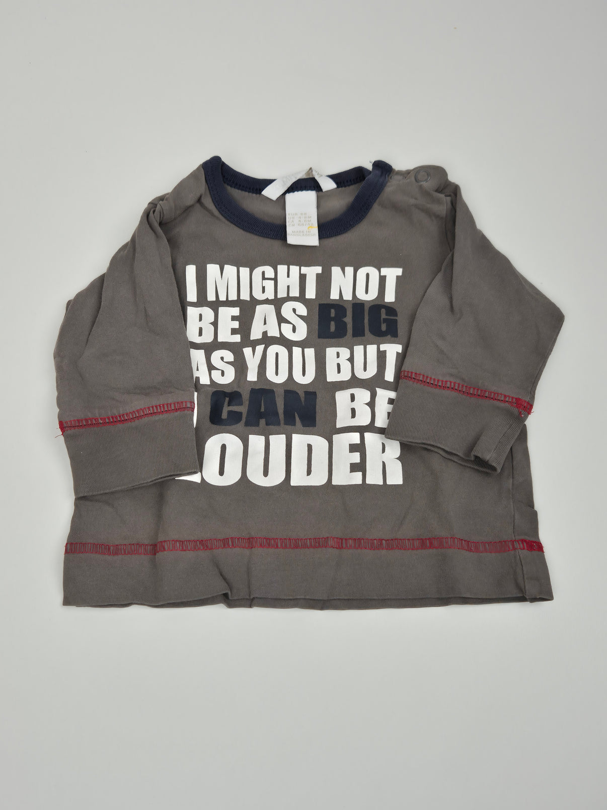 Chlapecké tričko H&M ve velikosti 68 – pohodlný bavlněný kousek s dlouhým rukávem a výrazným nápisem na přední straně („I MIGHT NOT BE AS BIG AS YOU BUT I CAN BE LOUDER“). Sportovní styl doplňují kontrastní červené švy a tmavě modrý lem kolem krku. Zapínání na rameni usnadní oblékání. Tričko je ideální na běžné denní nošení, do kočárku i do školky.