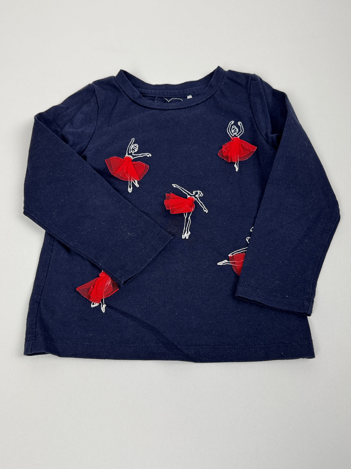 Originální tričko značky Knot ve velikosti 92, v tmavě modré barvě s dlouhým rukávem. Zdobí ho aplikace baletek s našitými červenými tylovými sukýnkami, které dodávají tričku hravý a elegantní vzhled....