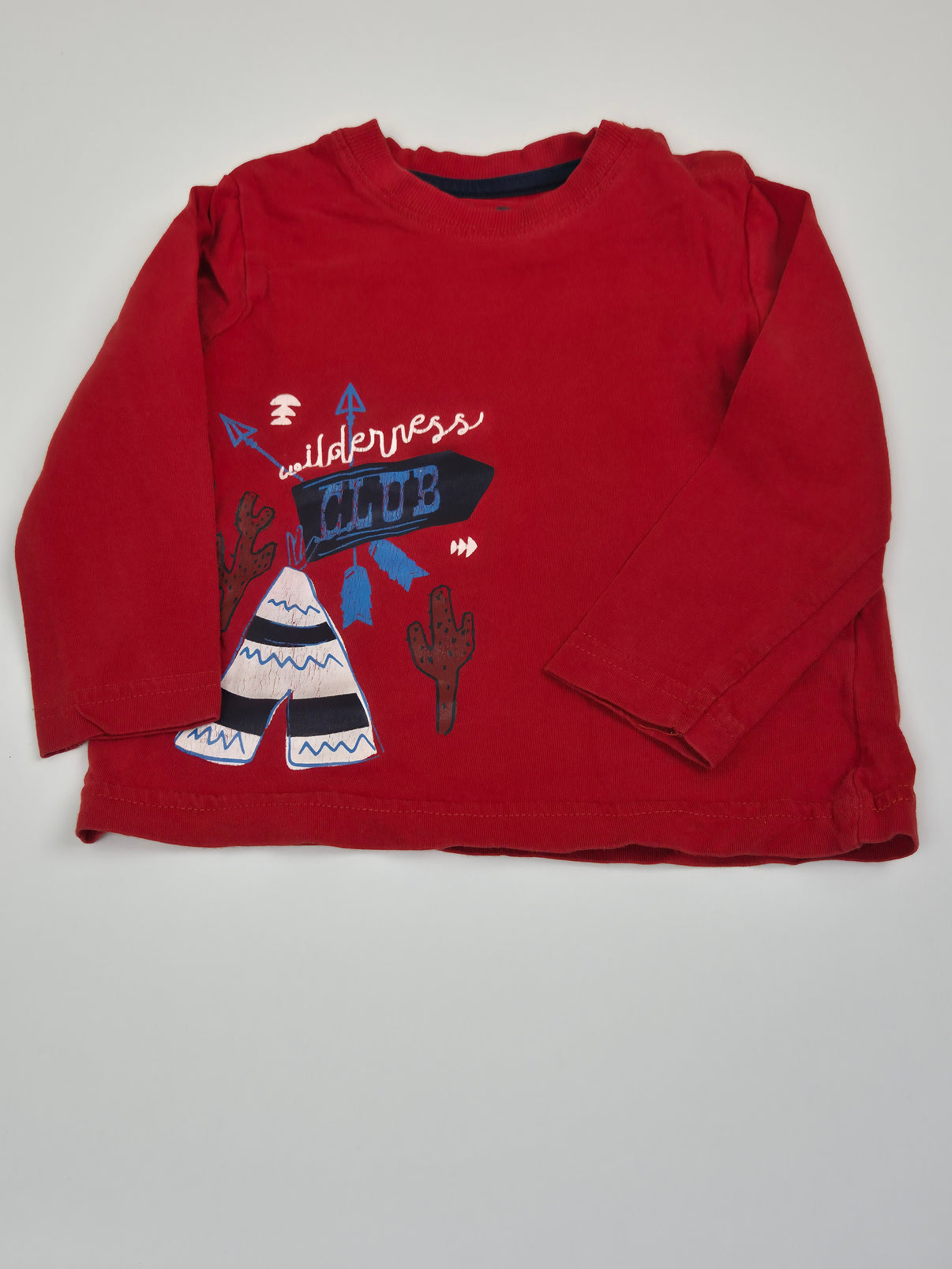 Chlapecké tričko Lupilu s dlouhým rukávem v krásné sytě červené barvě. Přední potisk s motivem teepee, kaktusů a nápisem Wilderness Club dodává tričku dobrodružný vzhled. Měkký bavlněný materiál je příjemný na celodenní nošení – skvělé do školky, na výlety i venkovní hraní.