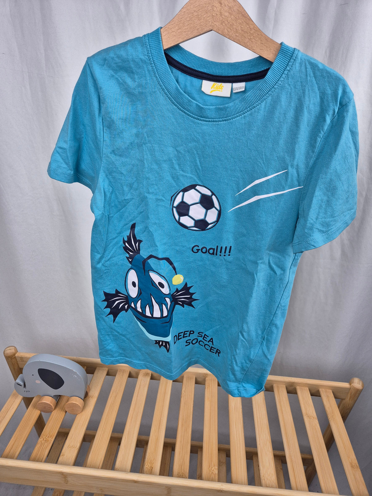 Toto tričko značky NKD ve velikosti 134/140 je jasně chlapecké. Má sytě tyrkysovou barvu a na přední straně zábavný potisk s rybou hrající fotbal doplněný o nápisy “Goal!!!” a “Deep Sea Soccer”. Díky motivu se sportovním nádechem se skvěle hodí na běžné nošení do školy, školky nebo na hřiště. Materiál působí lehce a příjemně na dotek, ideální pro teplé dny.