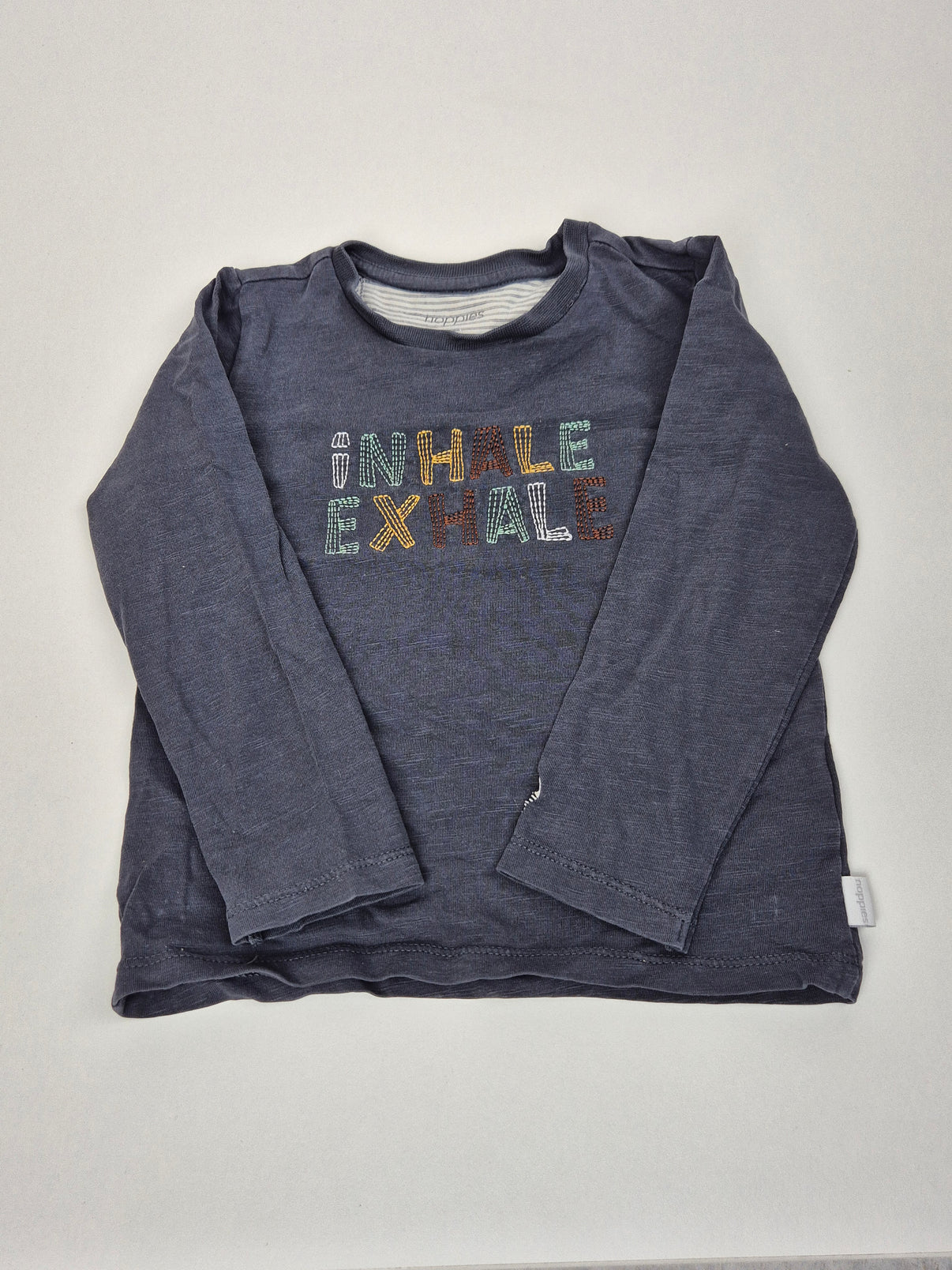 Stylové dětské tričko s dlouhým rukávem od značky Noppies. V tmavě modré barvě s barevným nápisem „Inhale Exhale“ na hrudi. Vyrobené z jemné bavlny, příjemné na dotek i nošení. Ideální do školky, na doma i ven.