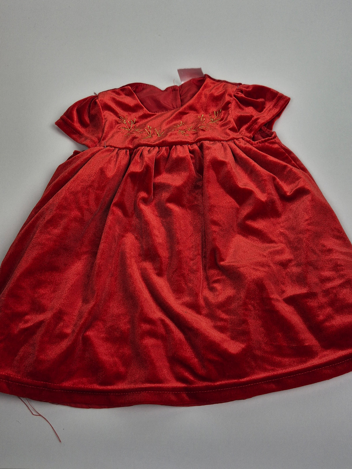 Červené sametové šaty Pepco, velikost 80, s krátkými rukávy a zlatou výšivkou na hrudníku. Pohodlné a elegantní, ideální pro malé holčičky na slavnostní příležitosti, oslavy nebo focení.