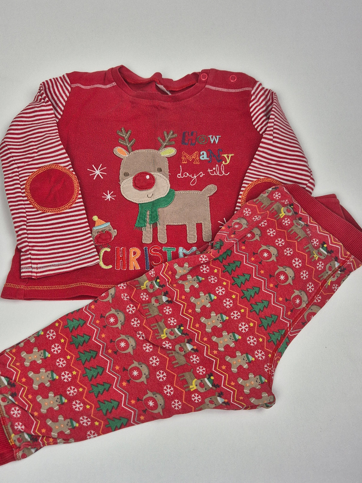 Roztomilý vánoční set značky F&F složený z trička s dlouhým rukávem a pohodlných legín. Tričko je v teplém červeném odstínu s vánočním motivem sobíka, výšivkami a nápisem How many days till Christmas, rukávy jsou doplněné červeno-bílými proužky a praktickým zapínáním na rameni. Legíny ladí barevně i tematicky – červený podklad s vánočními motivy sobíků, perníčků, stromků a vloček vytváří krásně hravý celek.