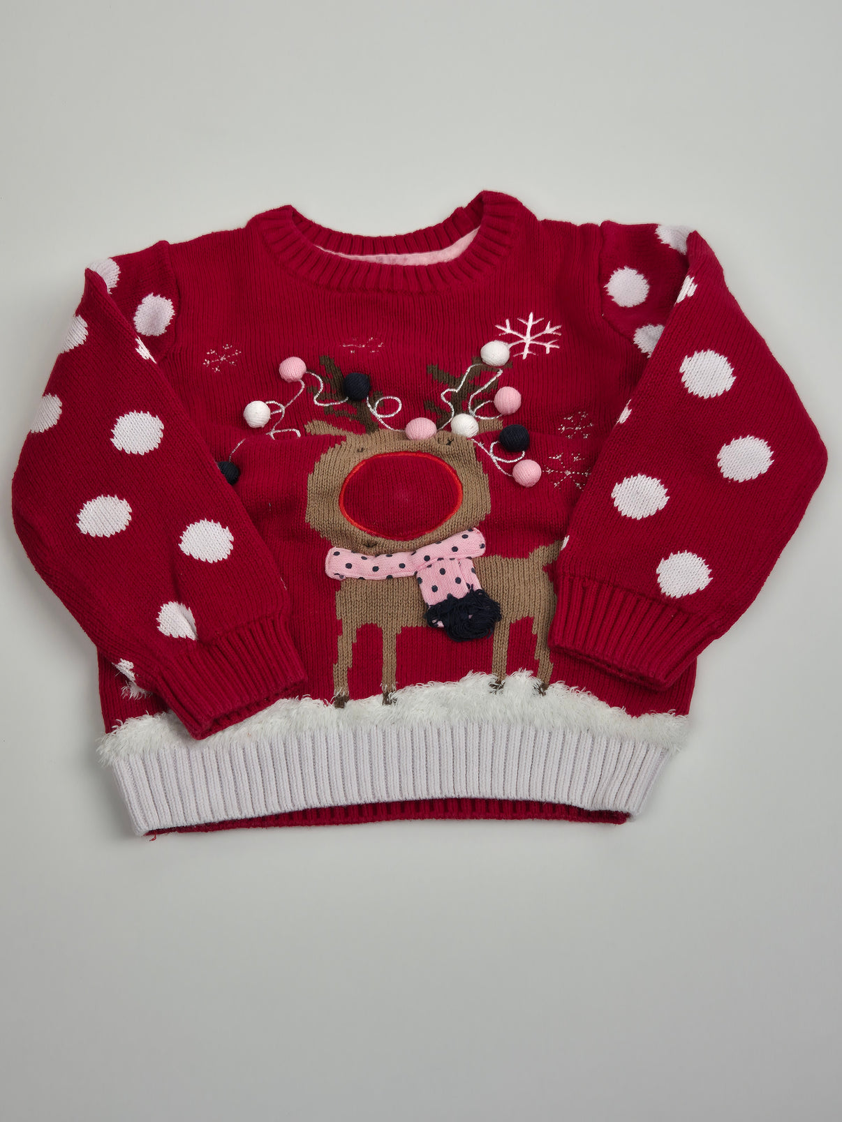 Roztomilý vánoční svetr F&F v sytě červené barvě s veselým motivem sobíka 🦌. Svetr je zdoben plastickými detaily (bambulky, výšivka), puntíkovanými rukávy a spodním lemem s jemným chlupatým zakončením, které dodává slavnostní vzhled. Ideální na vánoční focení, besídky, svátky i zimní dny. Příjemný úplet zahřeje a zároveň dobře vypadá.