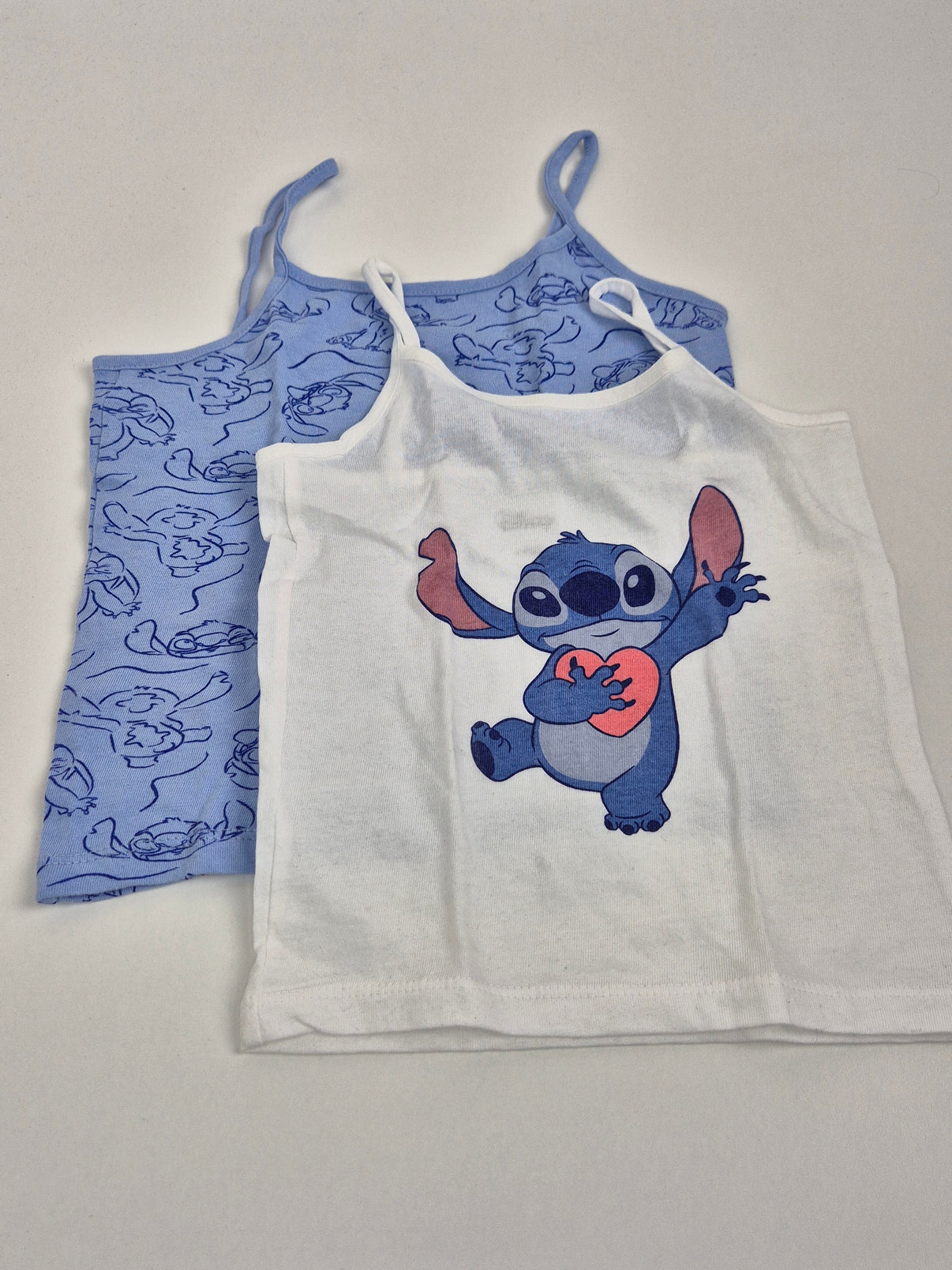 První tílko je sněhově bílé s velkým potiskem Stitch s růžovým srdíčkem, druhé v světle modré barvě zdobí jemný celoplošný Stitch motiv. Obě tílka mají tenká ramínka a lehký bavlněný materiál ideální na teplé dny – na hřiště, do školky i jen tak na doma. Perfektní letní duo pro malou parádnici.