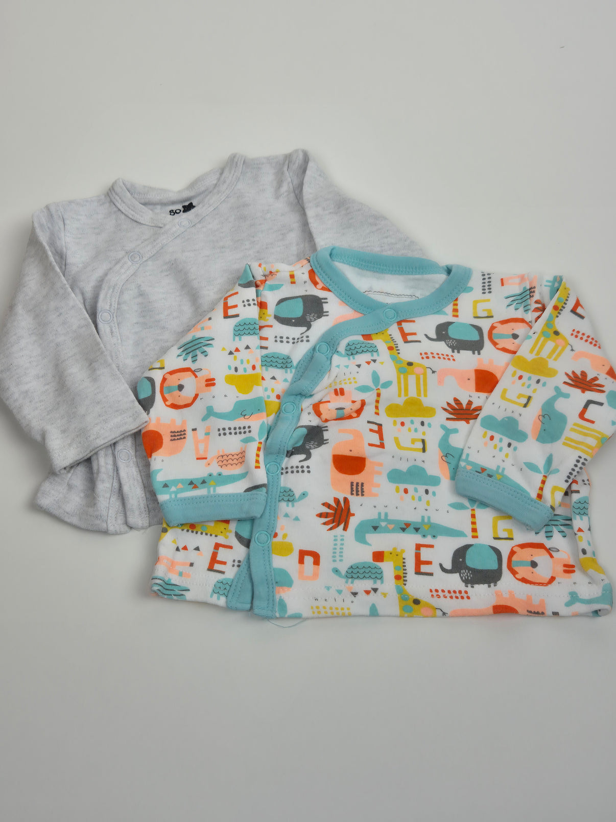 Sada dvou kojeneckých triček značky Pepco v hravém a jemném provedení. Jedno tričko je světle šedé, druhé bílé s veselým barevným potiskem zvířátek v odstínech tyrkysové, hořčicové, lososové a šedé. Barevná kombinace působí svěže a univerzálně, takže se sada hodí jak pro holčičku, tak pro kluka. Měkký bavlněný materiál je příjemný na dotek a ideální na každodenní nošení – do kočárku, na doma i do školky. Praktické zapínání na druky u krku usnadní oblékání i přebalování.