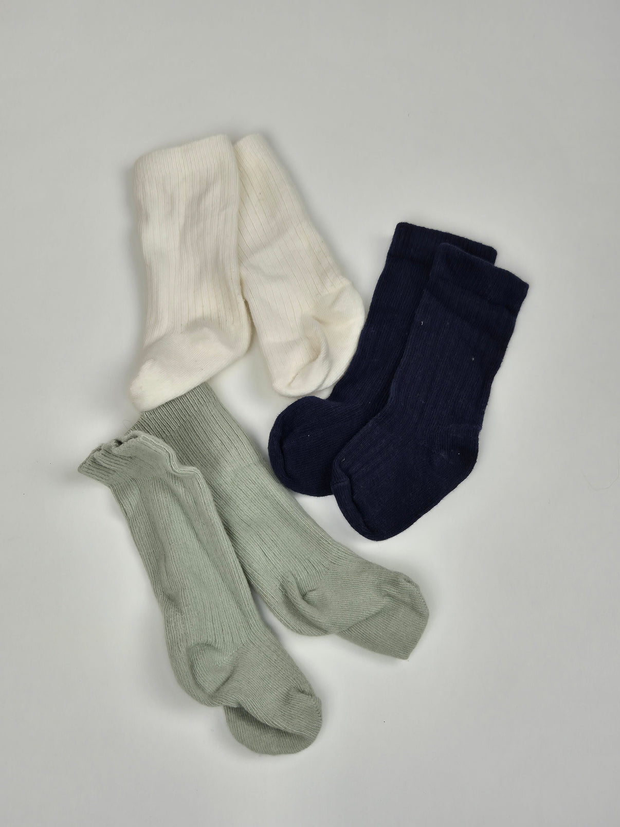Měkká sada 3 párů dlouhých ponožek ve velikosti 62, ideální pro miminko do kočárku i na doma. V balení najdeš tři krásné odstíny – čistě bílou, tmavě modrou a jemnou pastelově zelenou. Ponožky jsou žebrované, příjemně pružné a díky delšímu střihu dobře drží na nožičce a zahřejí i v chladnějších dnech. Unisex provedení vhodné pro holku i kluka.
