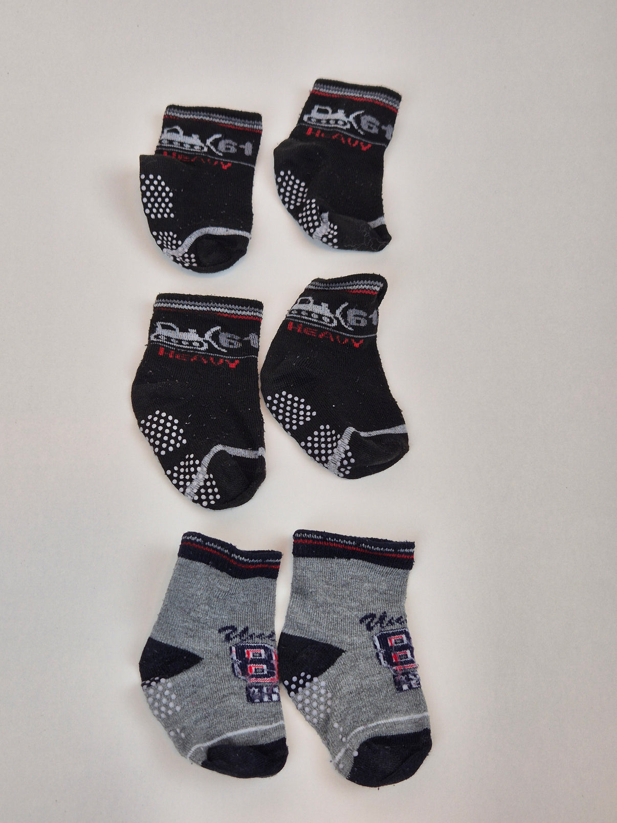 Sada tří párů dětských ponožek ve velikosti 74/86, ideální pro kluky na každodenní nošení. V balení najdeš dva černé páry s červenými detaily a jeden šedý pár s decentním potiskem. Protiskluzová úprava na chodidle pomáhá udržet stabilitu při lezení i prvních krůčcích. Ponožky jsou příjemné na nošení a hodí se jak na doma, tak do školky či na hřiště.