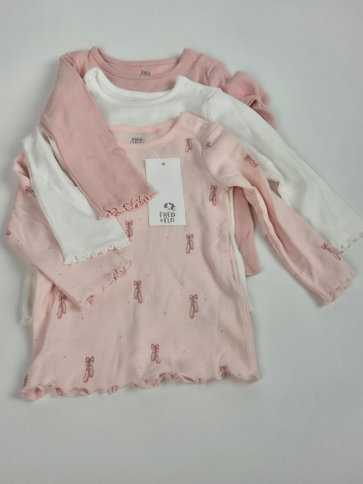 Sada tří triček značky F&F ve velikosti 74. V balení je jedno bílé, jedno světle růžové a jedno světle růžové s potiskem baletních střevíčků. Trička mají dlouhý rukáv a jemné volánkové zakončení rukávů i spodního lemu. Univerzální kousky pro holčičku, ideální na každý den.