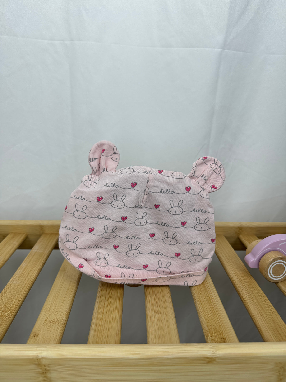 Roztomilá bavlněná čepice s oušky od značky F&F ve velikosti 86. Tato čepička je v jemné růžové barvě s potiskem roztomilých králíčků, nápisy „hello“ a drobnými srdíčky, což dodává veselý...