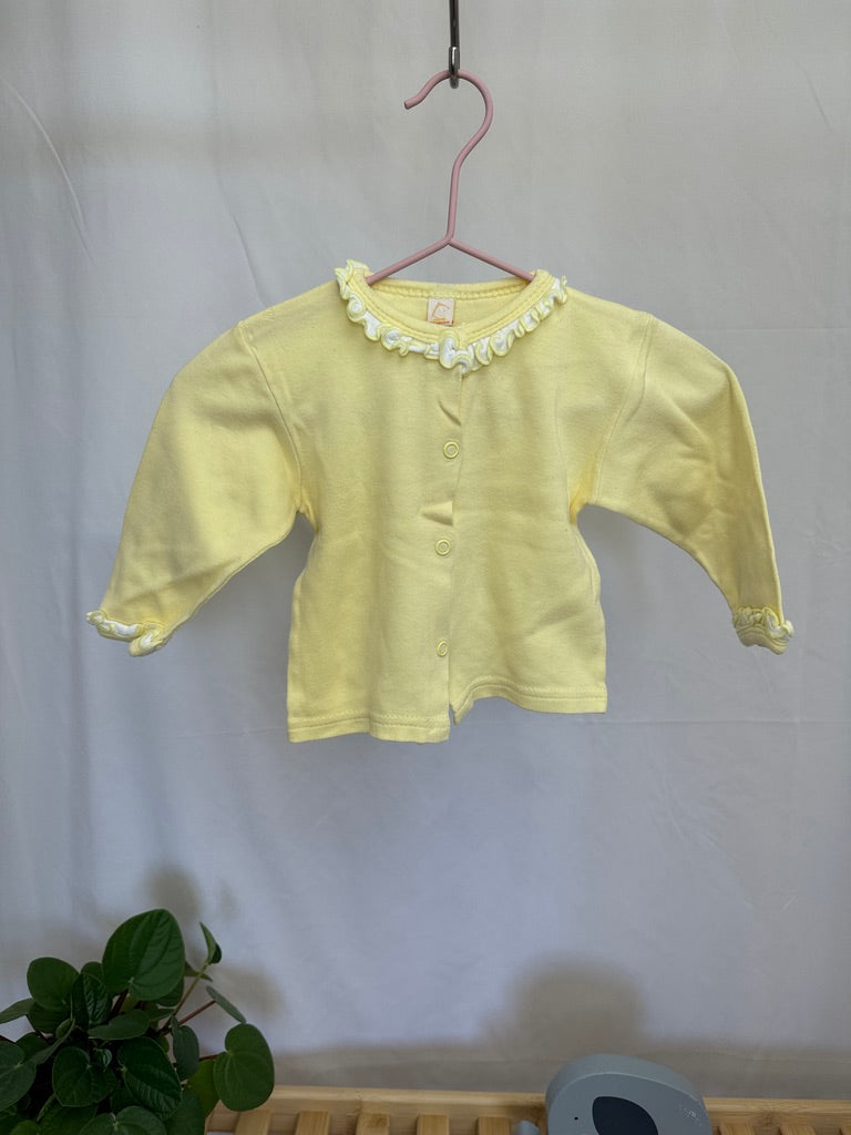 Světle žlutý kabátek Bobas ve velikosti 68 je ideální volbou pro malé princezny do chladnějších dnů. Vyrobený z jemné bavlny, kabátek je příjemný na dotek a poskytuje dostatek pohodlí. Zdobený roztomilými volánky kolem límečku a manžet, dodává kabátku jemný a něžný vzhled. Snadné zapínání na patentky usnadňuje oblékání a svlékání.