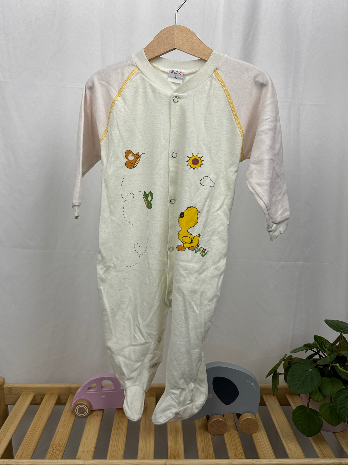 Bavlněný overal s dlouhým rukávem od značky V&K ve velikosti 92. Tento overal ve světle krémové barvě s kontrastními žlutými švy a roztomilými obrázky zvířátek je ideální volbou pro klidné spaní nebo domácí pohodu. Díky měkkému a příjemnému materiálu zajišťuje pohodlí po celý den i noc.
