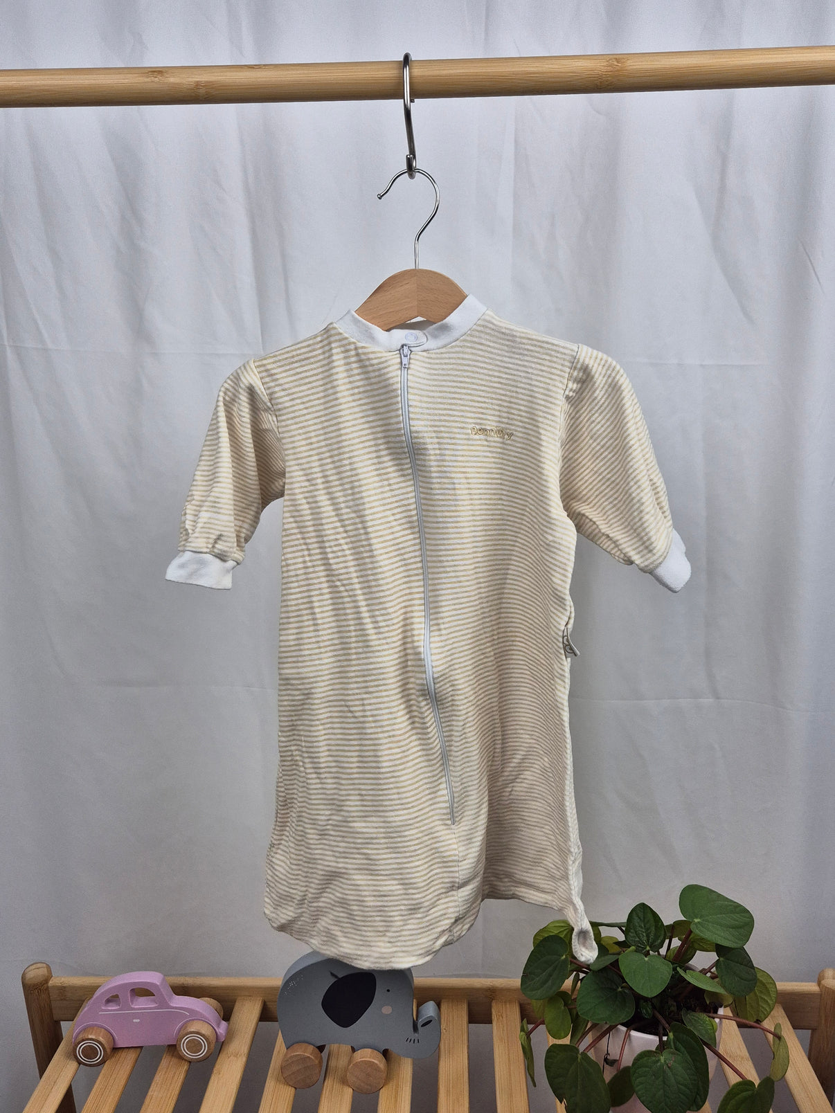 Pohodlný bavlněný spací pytel s dlouhým rukávem ve velikosti 74, ideální pro klidný spánek vašeho miminka. Jemný proužkovaný design v béžové a bílé barvě působí elegantně a neutrálně, hodí se jak pro holčičky, tak pro chlapečky. Zapínání na zip uprostřed usnadňuje manipulaci při převlékání nebo přebalování. Materiál je měkký a příjemný na dotek, šetrný k citlivé dětské pokožce. Perfektní volba pro pohodlné a bezpečné spaní během chladnějších nocí.