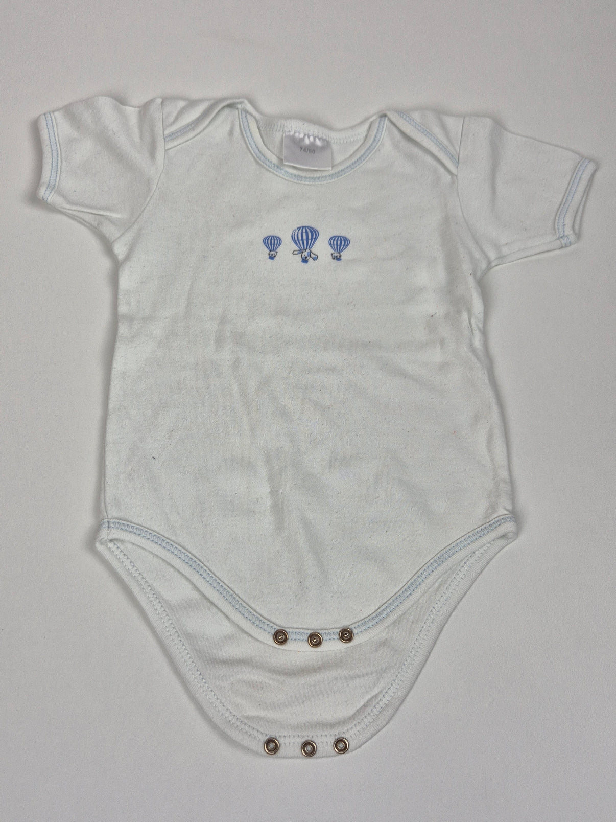 Jednoduché bílé body s krátkým rukávem a decentní modrou výšivkou balónků na hrudi. Svěží kousek do šatníku, který se skvěle hodí pro chlapečka i holčičku na běžné nošení. Praktické zapínání na cvočky mezi nožičkami usnadní převlékání i přebalování.