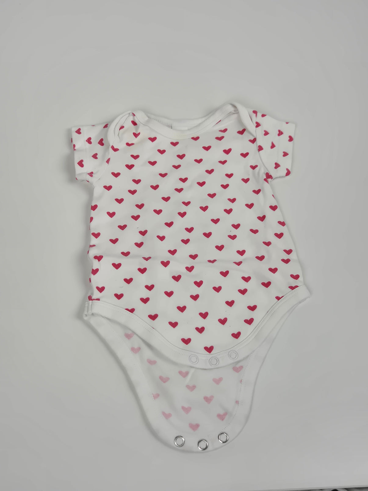 Bílé body C&A ve velikosti 74 s krátkým rukávem a zapínáním na patentky mezi nožičkami. Celoplošný vzor červených srdíček dodává roztomilý vzhled, ideální pro malé holčičky. Pohodlný bavlněný materiál se hodí na každodenní nošení.