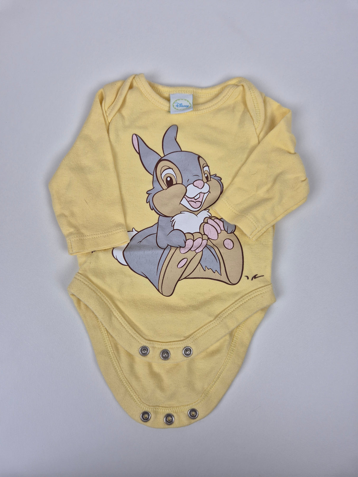 Žluté kojenecké body značky Disney ve velikosti 56 s dlouhým rukávem. Na přední straně zdobí veselý potisk zajíčka Tambelíny z pohádky Bambi, který dodává body roztomilý vzhled. Praktické zapínání na...