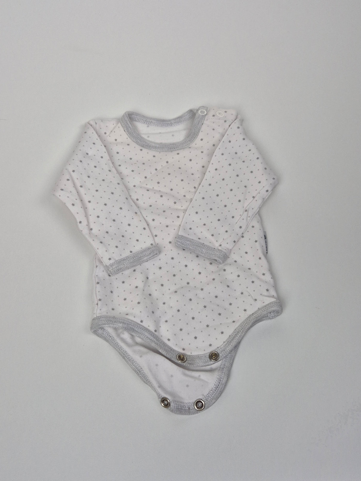 Jemné dětské body Esito ve velikosti 68 v bílé barvě s drobným potiskem šedých hvězdiček a decentním šedým lemováním. Praktické zapínání na rameni i mezi nožkami umožňuje snadné oblékání a přebalování. Vyrobené z měkké bavlny, která je prodyšná a příjemná na dotek — ideální pro běžné nošení po celý den.