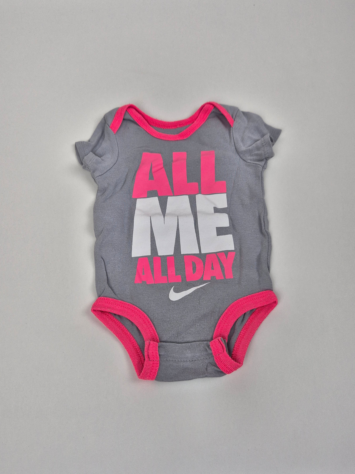 Sportovní body Nike ve velikosti 60/70 v šedé barvě s kontrastními růžovými lemy a výrazným nápisem „ALL ME ALL DAY“. Vyrobené z měkké, prodyšné bavlny s příměsí elastanu pro volnost...