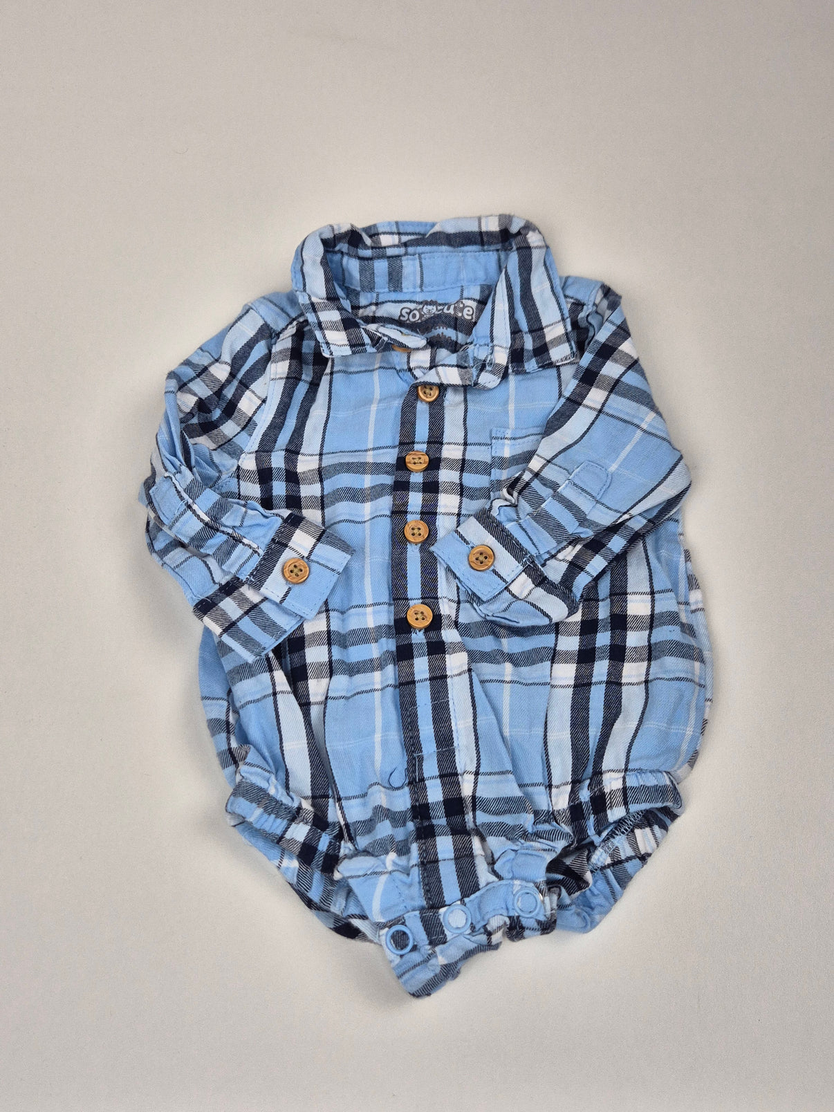 Tohle body-košile značky Pepco ve velikosti 62 má kostkovaný vzor v modrých tónech a knoflíčky na přední straně. Díky zapínání mezi nožičkami drží hezky na místě a zároveň působí elegantně...