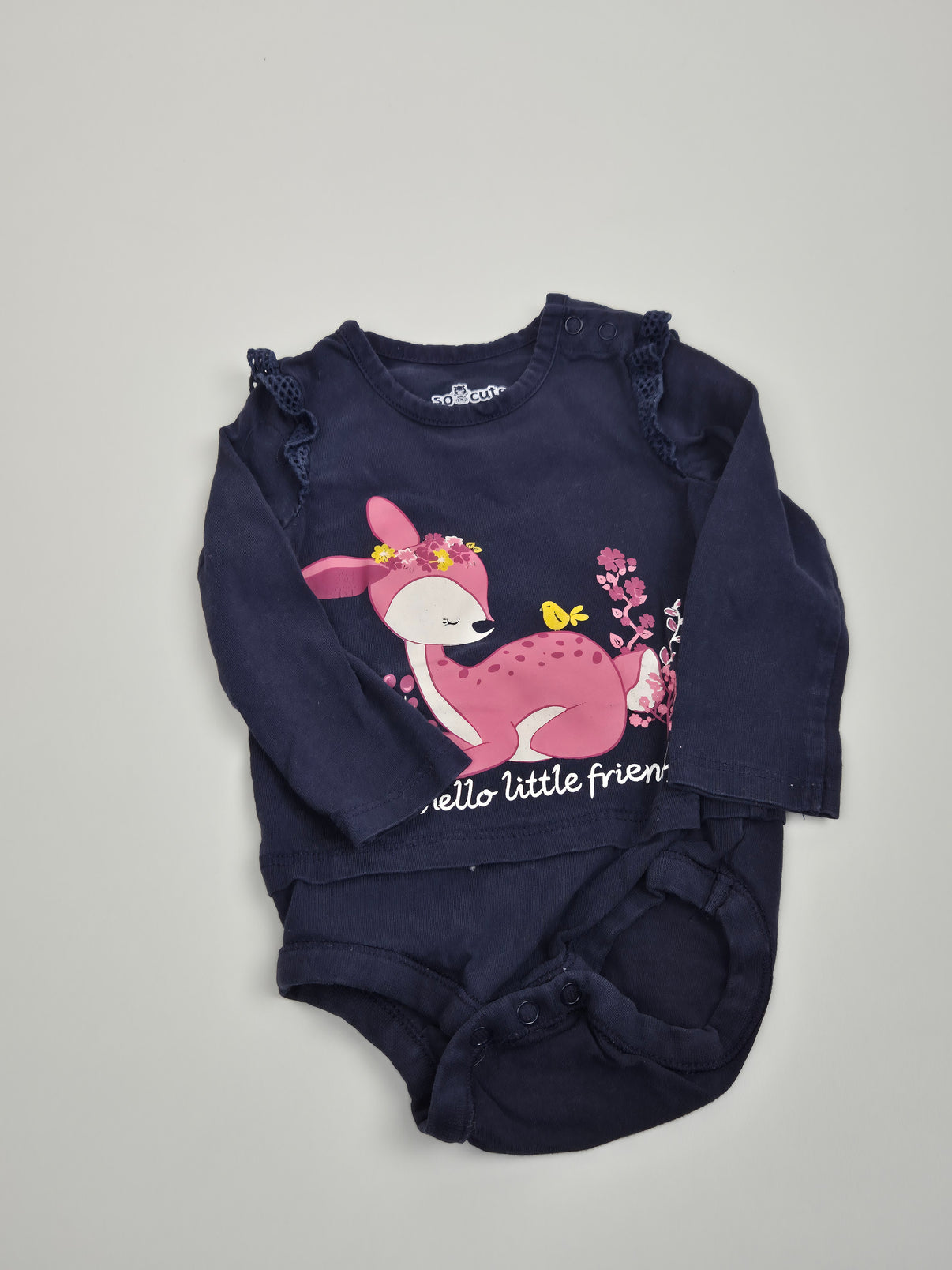 Roztomilé body s dlouhým rukávem v tmavě modrém (námořnickém) odstínu, který krásně zvýrazňuje něžný potisk růžového kolouška s květinovou korunkou. Jemné detaily v růžové, bílé a žluté barvě dodávají body pohádkový a klidný vzhled, ideální pro malé holčičky.
