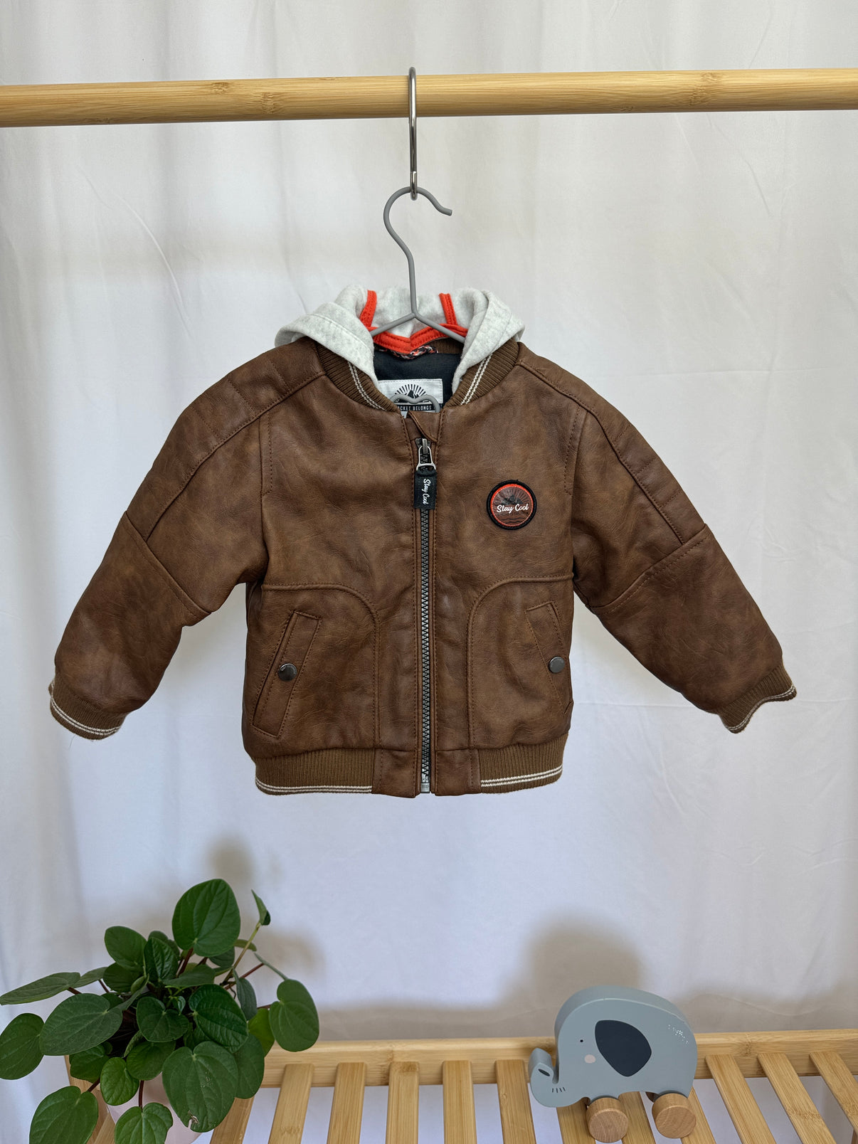Koženková bunda C&A pro kluky ve velikosti 80 s kapucí z šedého materiálu, která dodává bundě ležérní vzhled. Elegantní hnědá koženka v kombinaci s nášivkou na hrudi „Stay Cool“ vytváří moderní a stylový kousek. Zapínání na zip a dvě přední kapsy na druky dodávají praktický prvek, ideální na procházky i do města.
