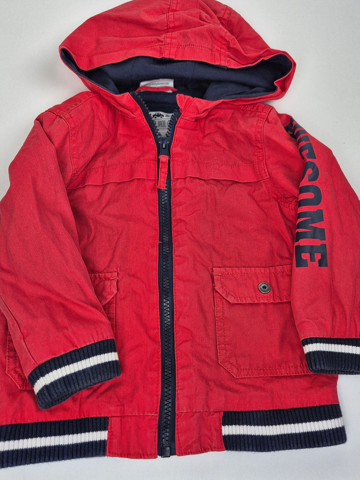 Parádní jarní/podzimní bunda Topomini v sytě červené barvě s tmavě modrými detaily. Má kapuci, žebrované lemy na rukávech i spodním okraji v námořnickém stylu (tmavě modrá s bílými pruhy) a praktické kapsy na přední straně. Na rukávu je stylový potisk „AWESOME“. Uvnitř je měkká bavlněná podšívka, díky které je bunda pohodlná a příjemná i při chladnějším počasí. Ideální pro chlapečka.
