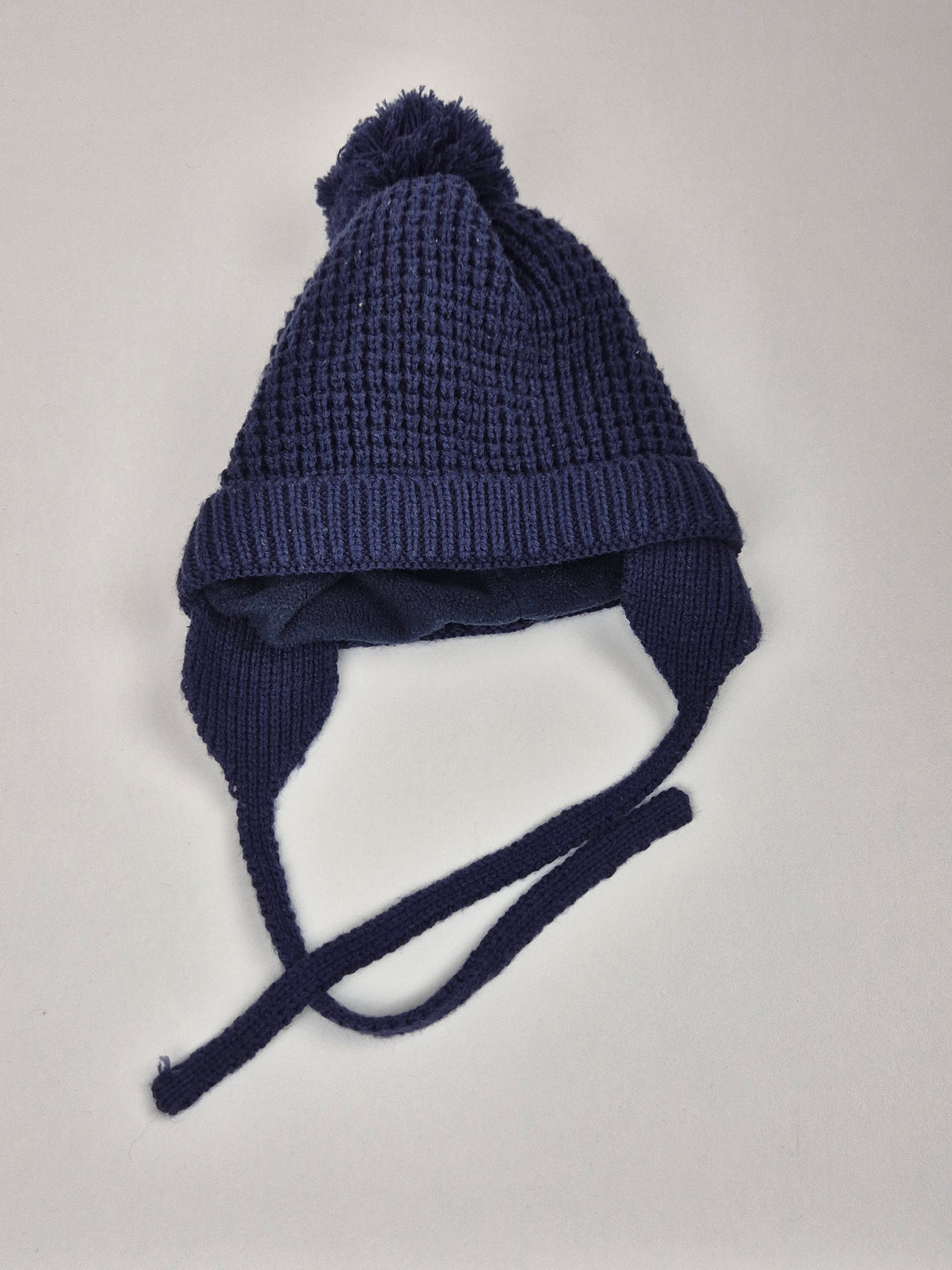 Teploučká zimní čepice v tmavě modré barvě s bambulkou a vázáním pod bradou. Vyrobená z měkkého, hřejivého úpletu s jemnou fleece podšívkou, která chrání ouška a hlavičku před chladem. Strukturovaný vzor dodává čepici stylový vzhled, zatímco praktické zavazování udrží čepici bezpečně na místě.