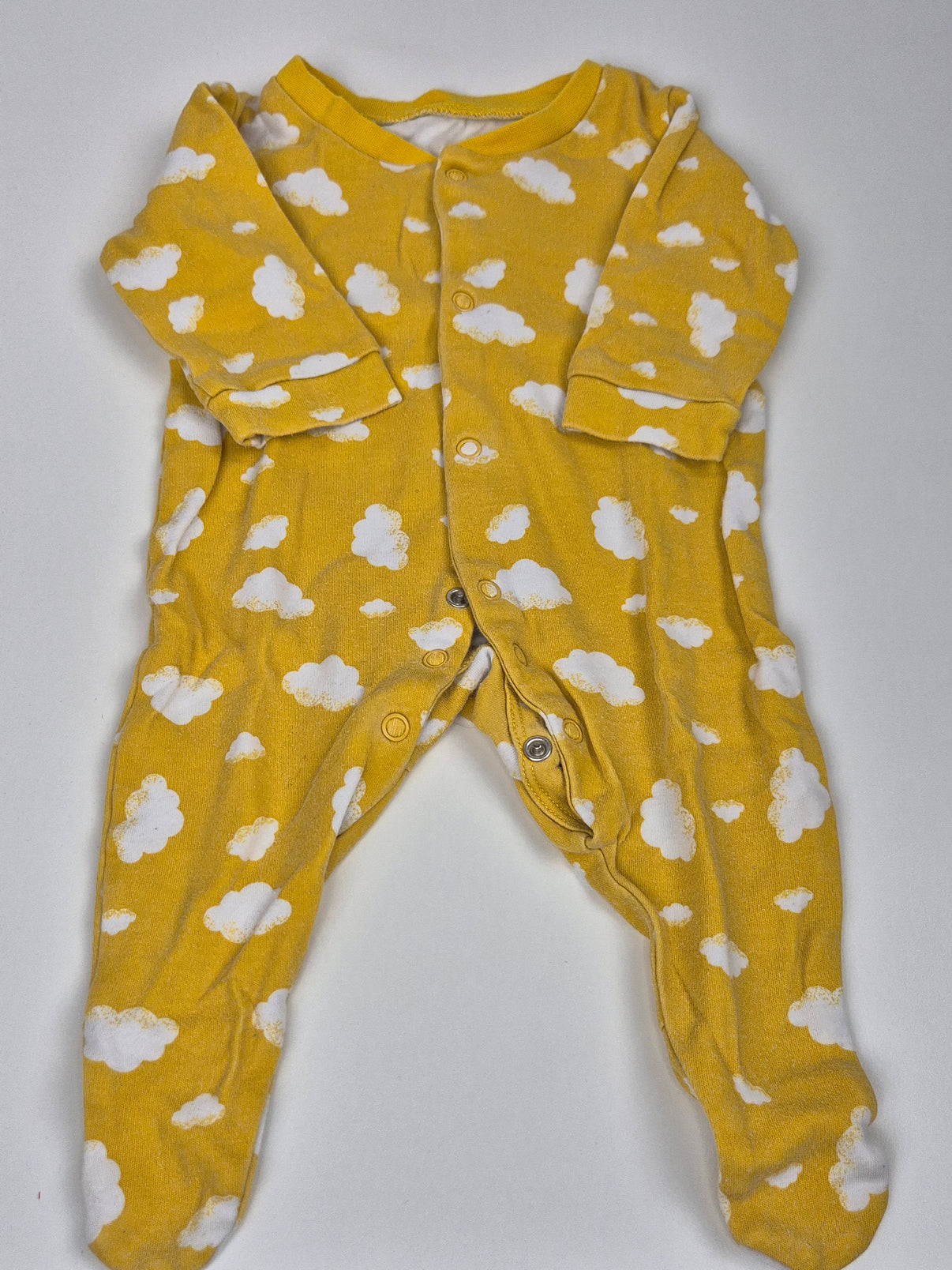 Měkoučké kojenecké dupačky ve velikosti 62 v krásné hořčicově žluté barvě s potiskem bílých obláčků. Vyrobené z příjemné, prodyšné bavlny, která je šetrná k citlivé pokožce miminka. Praktické zapínání na patentky po celé délce i mezi nožičkami usnadňuje oblékání i přebalování.