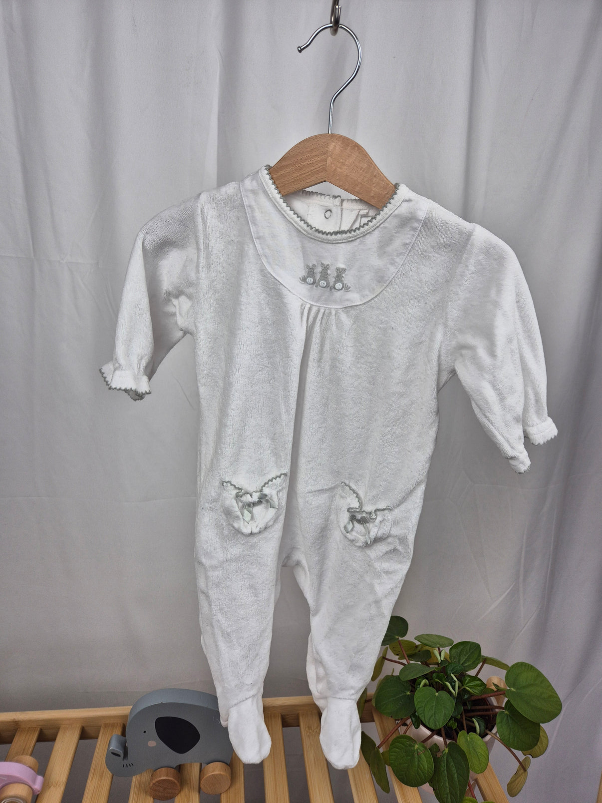 Elegantní a jemné dupačky značky Next ve velikosti 68 v krémově bílé barvě jsou jako stvořené pro slavnostnější příležitosti i pohodlné denní nošení. Dupačky mají roztomilé detaily – výšivku tří medvídků u krku, mašličky na kapsičkách a decentní lemování na rukávech. Měkoučký materiál a zapínání na zádech i mezi nožičkami zajišťují snadné oblékání i přebalování. Ideální pro malé slečny, které chtějí být šik i v prvních měsících života.