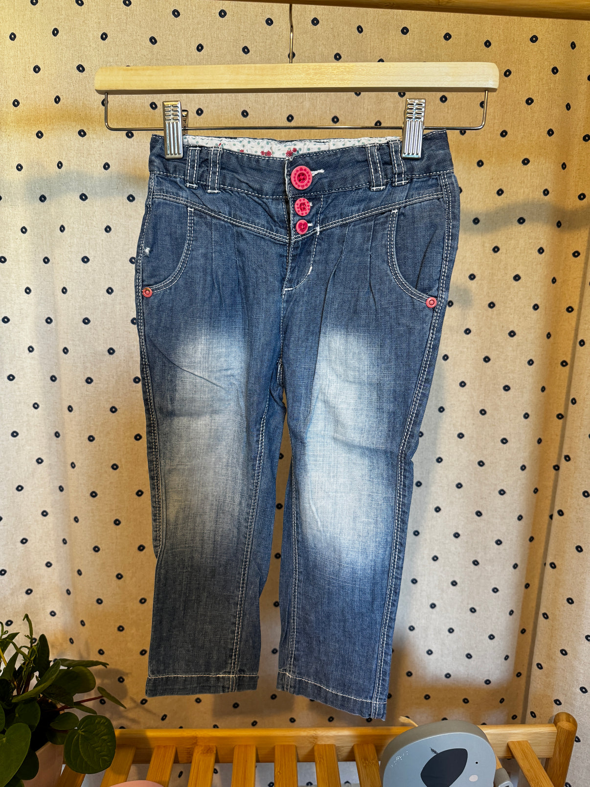 Roztomilé dívčí džíny od značky Dopodopo v světle modrém odstínu s jemným opraným efektem. Džíny mají stylové červené knoflíky a detaily, které dodávají moderní vzhled. Elastický pas zajišťuje pohodlí a snadné oblékání. Přední a zadní kapsy jsou praktické pro malé poklady. Ideální na každodenní nošení, do školky nebo na venkovní hrátky.