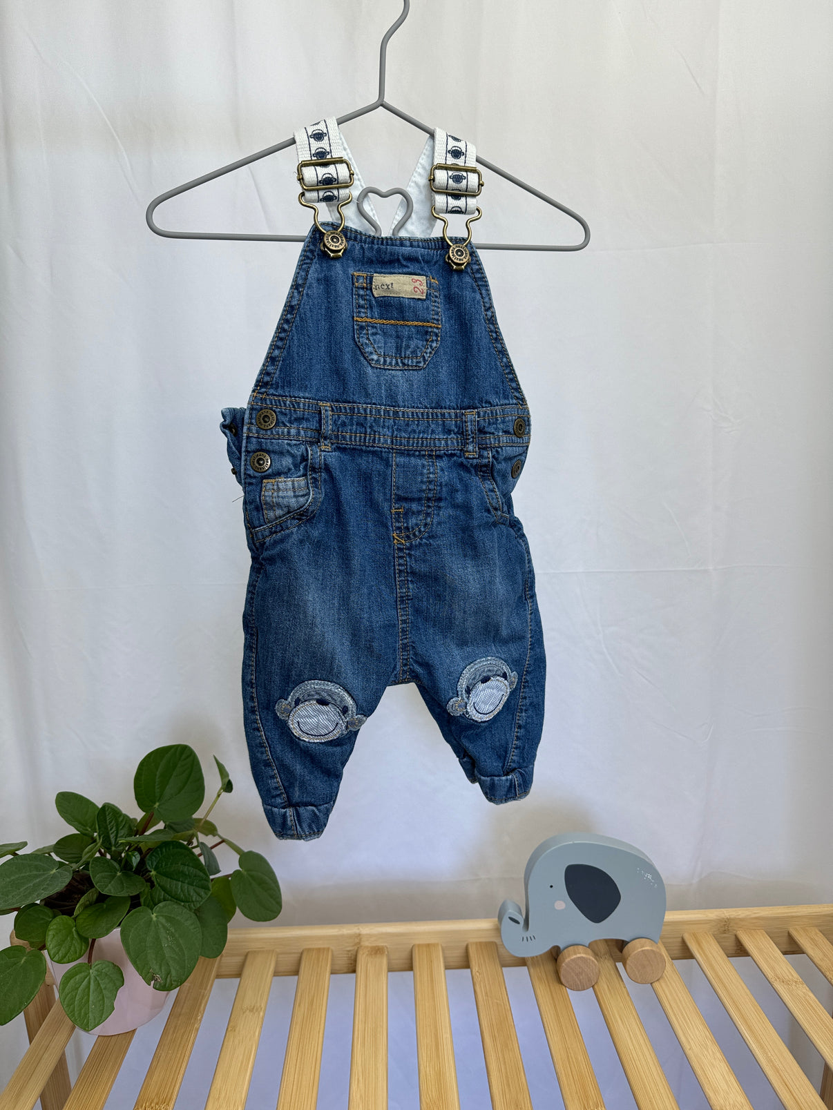 Roztomilé džínové lacláče od značky Next ve velikosti 68 jsou ideálním kouskem pro vašeho chlapečka. Díky praktickým knoflíkům na ramínkách a bočnímu zapínání se snadno oblékají. Návrh je ozdoben vyšívanými nášivkami ve tvaru opiček na kolenou, což dodává kalhotám hravý a stylový vzhled. Ideální volba na každodenní nošení i venkovní dobrodružství.