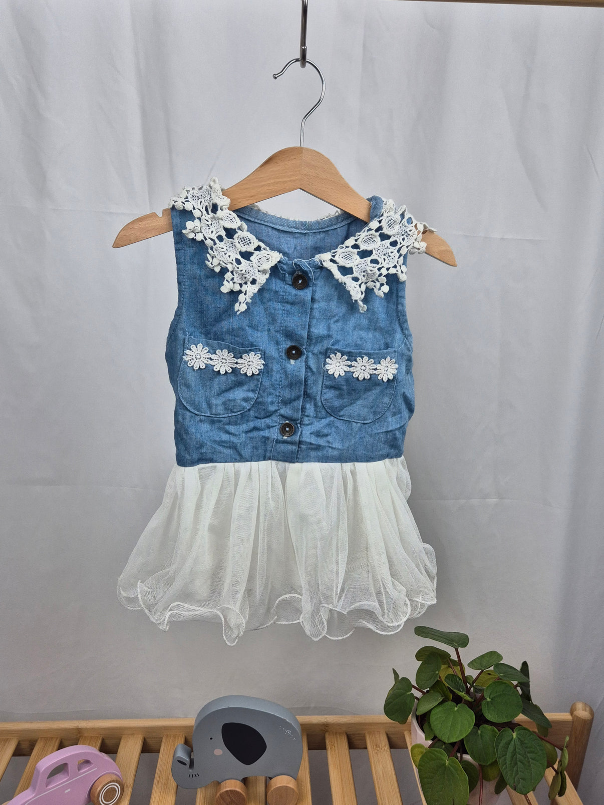 Roztomilá dívčí halenka bez rukávů v kombinaci džínoviny a jemného tylu. Horní část v denimovém stylu je zdobená krásným krajkovým límečkem a ozdobnými květinovými aplikacemi na kapsách, což dodává haleně romantický vzhled. Spodní část je tvořena lehkou bílou tylovou sukýnkou, která působí vzdušně a elegantně. Na zadní straně je doplněna stylovou mašličkou pro ještě větší roztomilost. Ideální volba pro slavnostní příležitosti, rodinné oslavy nebo letní procházky.