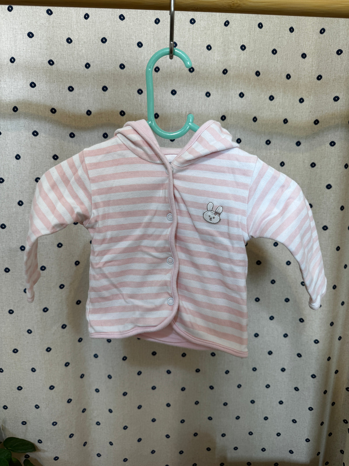 Roztomilý dětský kabátek značky C&A ve velikosti 68. Tento růžovo-bílý pruhovaný kabátek s kapucí je ideální pro chladnější dny. Kabátek je zdobený výšivkou roztomilého králíčka na přední straně a má praktické zapínání na patentky, což usnadňuje oblékání a svlékání. Vyrobeno z měkkého a pohodlného materiálu, který zajistí vašemu miminku teplo a komfort. Perfektní volba pro malé princezny na každodenní nošení venku nebo na výlety.