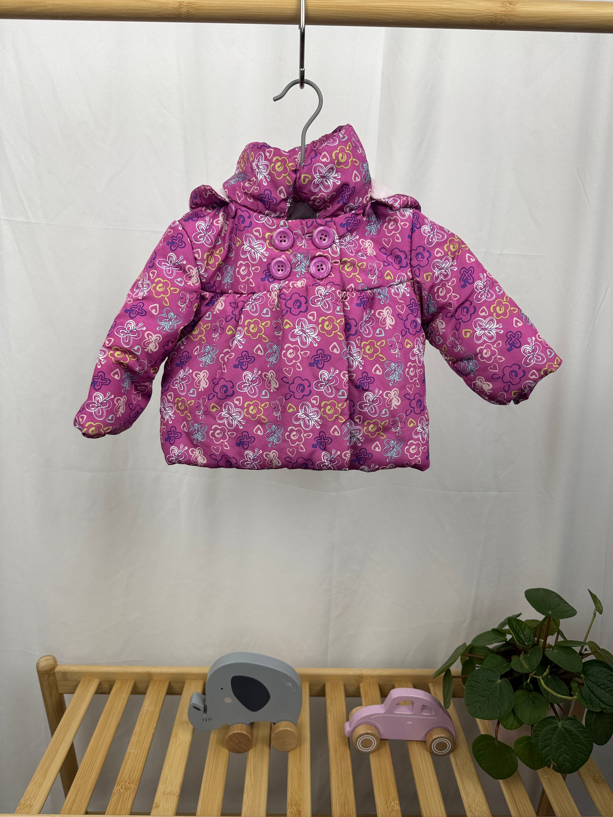 Pohádkový dětský kabátek od značky F&F ve velikosti 74. Tento kabátek má krásný růžový podklad s barevným květinovým potiskem, který dodává veselý a hravý vzhled. Kabátek je vybaven vysokým límcem a řadou ozdobných knoflíků na přední straně pro stylový detail. Zateplený vnitřek a měkká podšívka zajišťují teplo a pohodlí během chladných dnů. Rukávy a zadní strana poskytují dostatek volnosti pro pohyb. Skvělá volba pro malé slečny, které chtějí být v teple a zároveň vypadat rozkošně. Perfektní na procházky i speciální příležitosti.