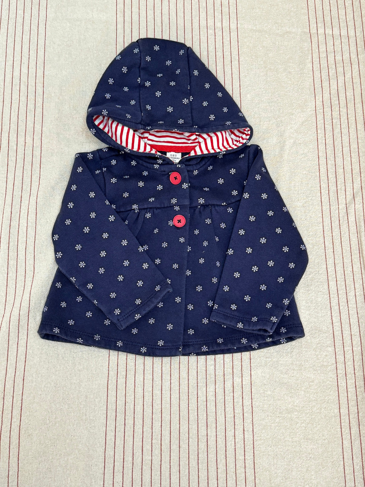 Roztomilý dětský kabátek od značky LC Waikiki ve velikosti 74/80, ideální pro malé holčičky. Tento kabátek v tmavě modré barvě je ozdoben jemným květinovým vzorem, který dodává oblečení dívčí šarm. Kabátek je vybaven kapucí, která je z vnitřní strany podšitá pruhovanou látkou v červeno-bílé kombinaci, což přidává hravý kontrast. Zapínání na přední straně je řešeno třemi výraznými červenými knoflíky, které nejenže skvěle ladí s vnitřním lemováním, ale také usnadňují oblékání a svlékání. Tento kabátek je ideální volbou pro chladnější dny, kdy je potřeba udržet vaše dítě v teple a zároveň stylově oblečené.
