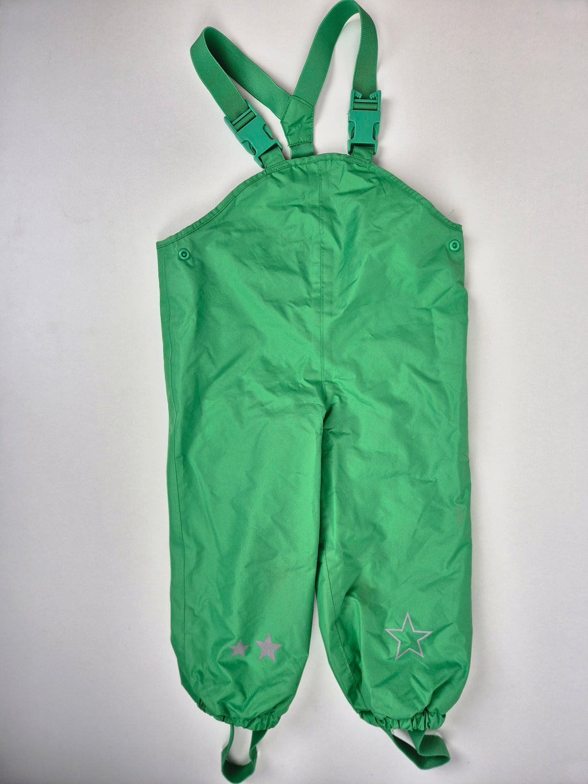 Dětské kalhoty do deště značky Tchibo ve velikosti 86/92 v zelené barvě. Mají praktické šle s nastavitelnou délkou, pružné nohavice se silikonovými pásky proti vyhrnování a reflexní hvězdičky pro lepší viditelnost. Ideální na deštivé dny a hraní venku.