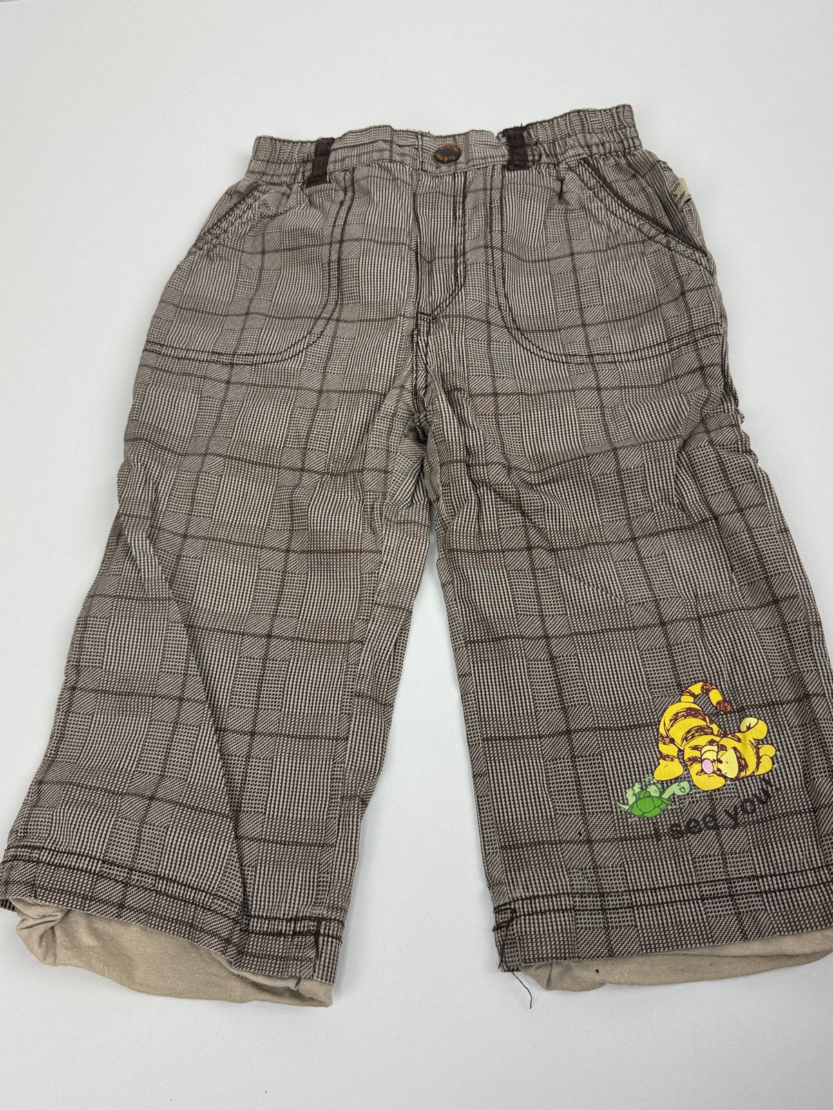 Kalhoty s motivem Medvídka Pú ve velikosti 86 v béžovo-hnědém kostkovaném vzoru. Na nohavici je veselý obrázek Tygra, který dodává kousku hravý detail. Kalhoty mají kapsy vpředu i vzadu a pružný pas pro pohodlné nošení. Ideální na každodenní dobrodružství pro chlapečka.