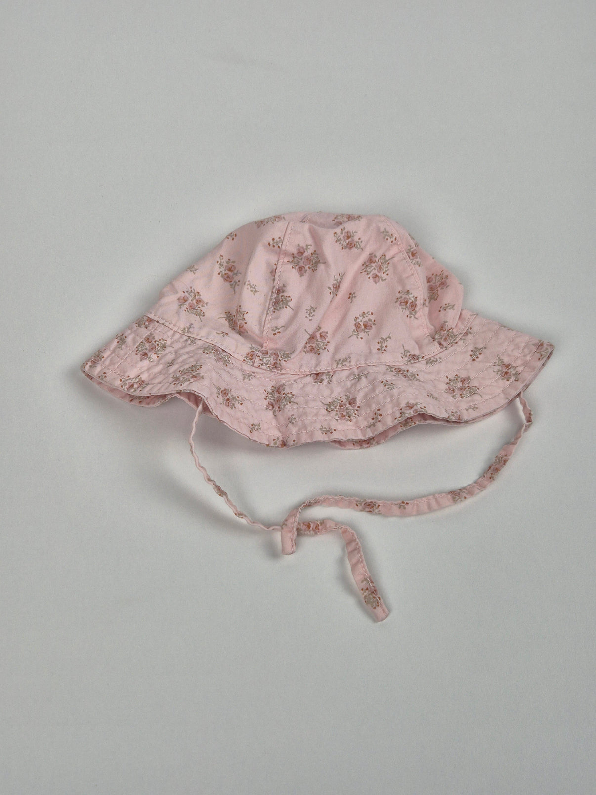 Letní klobouček značky H&M ve velikosti 62/68. Světle růžový podklad zdobí drobný květinový vzor v jemných tónech, který působí romanticky a něžně. Klobouček má širší okraj pro lepší ochranu před sluncem a praktické šňůrky na zavazování pod bradou, aby dobře držel na místě. Perfektní doplněk pro malé holčičky na slunečné dny.