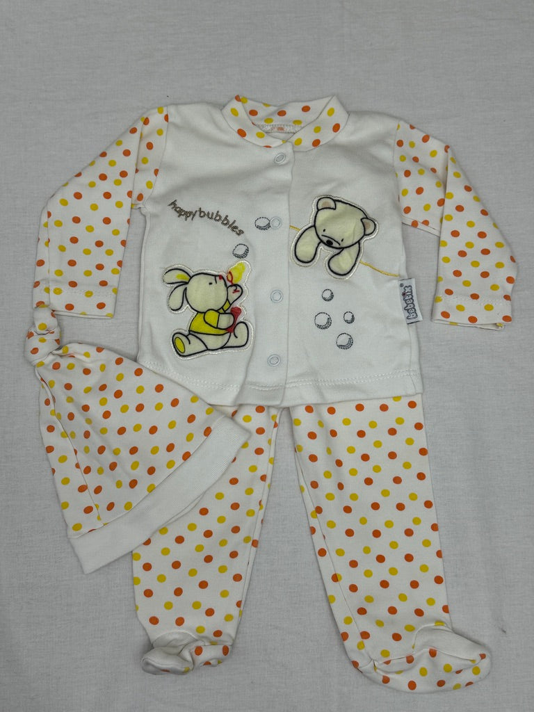 Roztomilý tří dílný komplet značky Bebetix ve velikosti 56 obsahuje kabátek, kalhoty a čepičku. Tento jemný set je ideální pro novorozence. Kabátek je zdoben veselým motivem králíčka a medvídka s nápisem "Happy Bubbles" a praktickým zapínáním na patentky. Kalhoty i čepička mají barevný vzor puntíků v oranžových a žlutých odstínech. Set je vyroben z příjemného bavlněného materiálu, který poskytuje pohodlí pro citlivou dětskou pokožku. Perfektní volba na doma i na ven. Vhodné jako dárek.