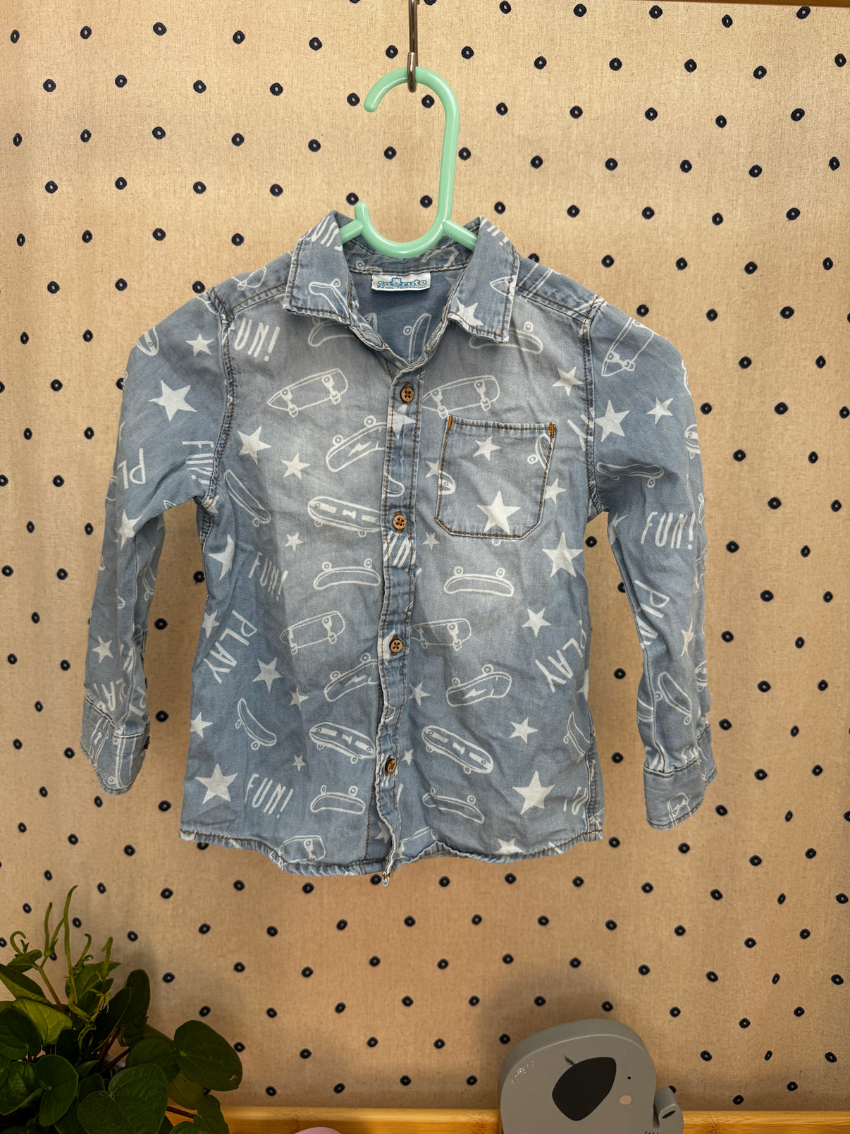Džínová košile s dlouhým rukávem od značky Pepco, velikost 92. Tato stylová košile je zdobena hravým potiskem skateboardů, hvězd a nápisů "FUN!" a "PLAY". Ideální volba pro malé chlapce, kteří chtějí vypadat skvěle a cítit se pohodlně. Perfektní na běžné nošení nebo na speciální příležitosti.
