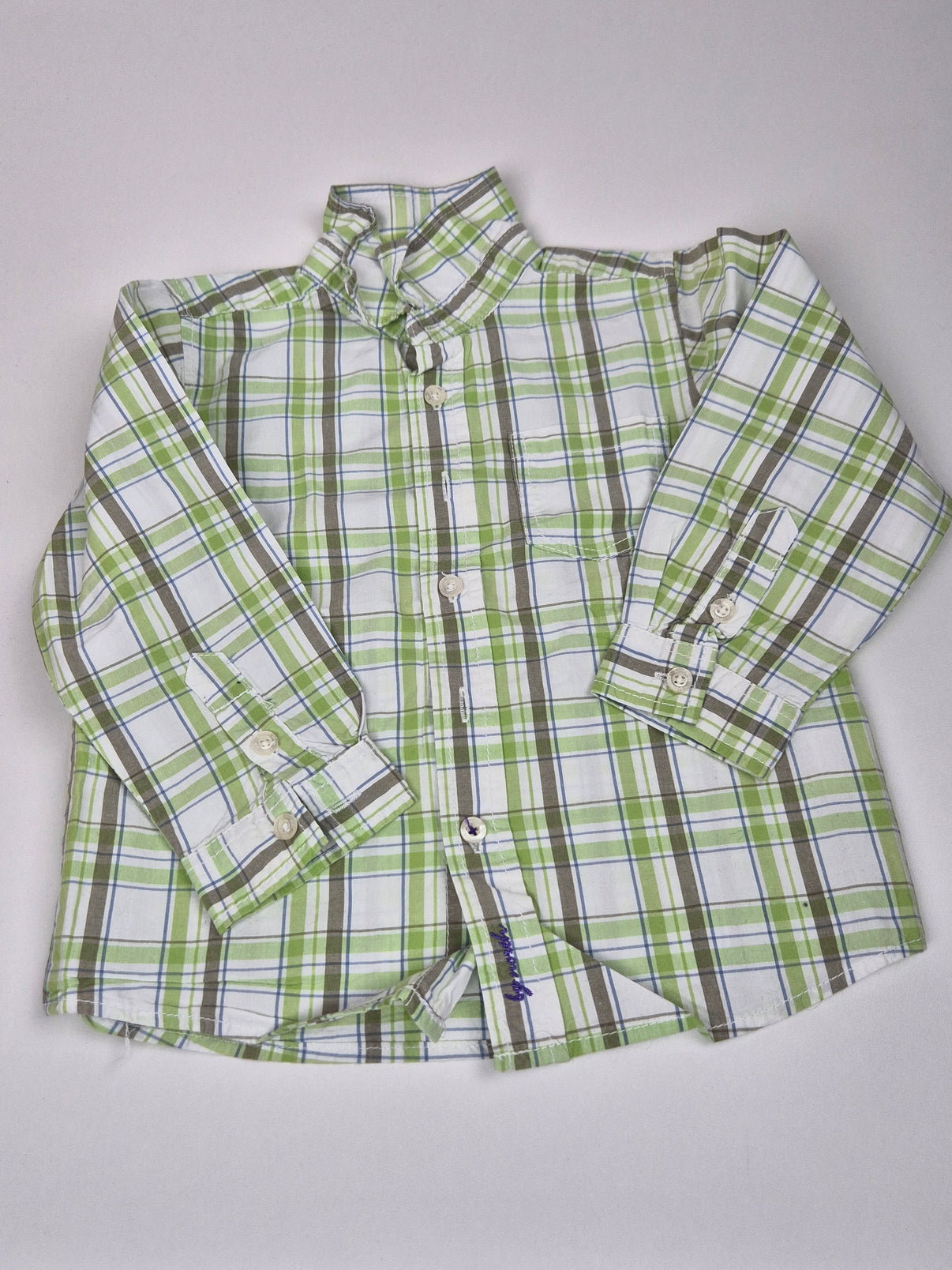 Krásná chlapecká košile od značky Zara v bílé barvě s výrazným zeleným a šedým kostkovaným vzorem. Pohodlný střih se zapínáním na knoflíčky a kapsičkou na hrudi je ideální jak na běžné nošení, tak i pro slavnostnější příležitosti. Díky příjemnému materiálu se bude malý fešák cítit vždy skvěle.
