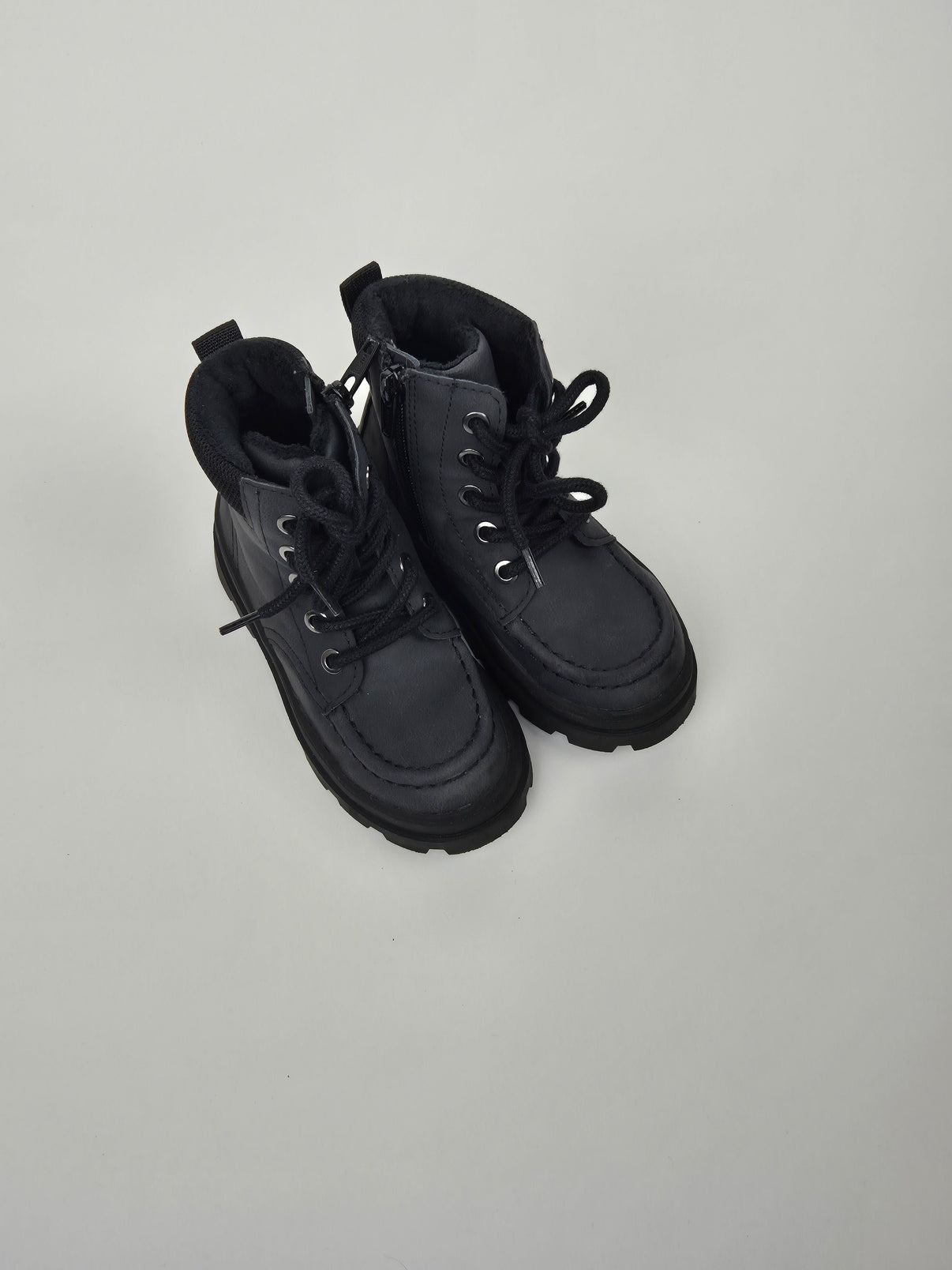 Stylová kotníková obuv H&M v univerzální černé barvě je ideálním kouskem pro podzim i zimu. Botky mají pevný svršek s měkkým zateplením uvnitř, takže krásně zahřejí, a zároveň poskytují dobrou oporu při chůzi. Praktické zapínání na zip z vnitřní strany doplněné o tkaničky zaručuje snadné obouvání i perfektní přizpůsobení noze. Robustní podrážka s výrazným vzorkem je vhodná i do horších podmínek.