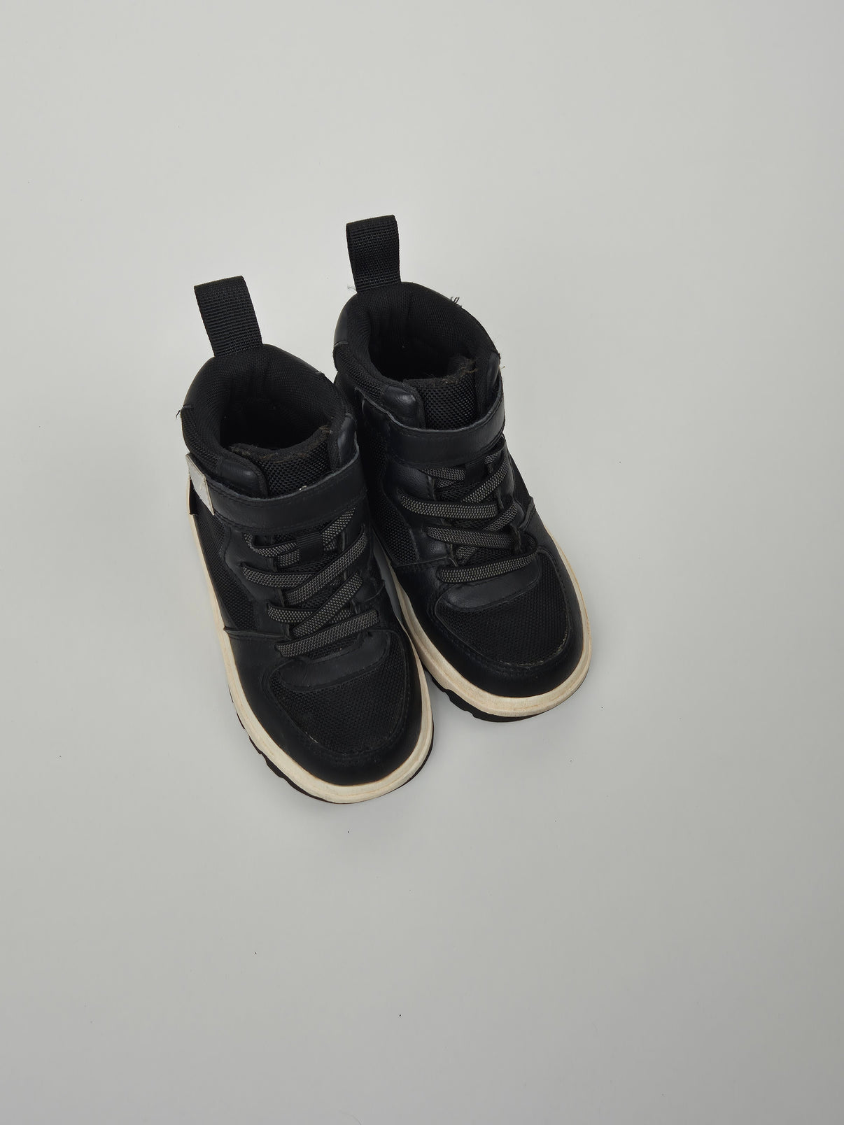 Pohodlná kotníková obuv H&M v moderním sportovním stylu skvěle doplní každý dětský outfit. Boty jsou v černé barvě s kontrastní bílou podrážkou, která jim dodává ležérní vzhled. Kombinace textilního a koženkového materiálu zaručuje odolnost i komfort při nošení. Díky praktickému suchému zipu a elastickým tkaničkám se botky snadno obouvají a dobře drží na noze. Ideální volba do školy, na hřiště i běžné nošení.