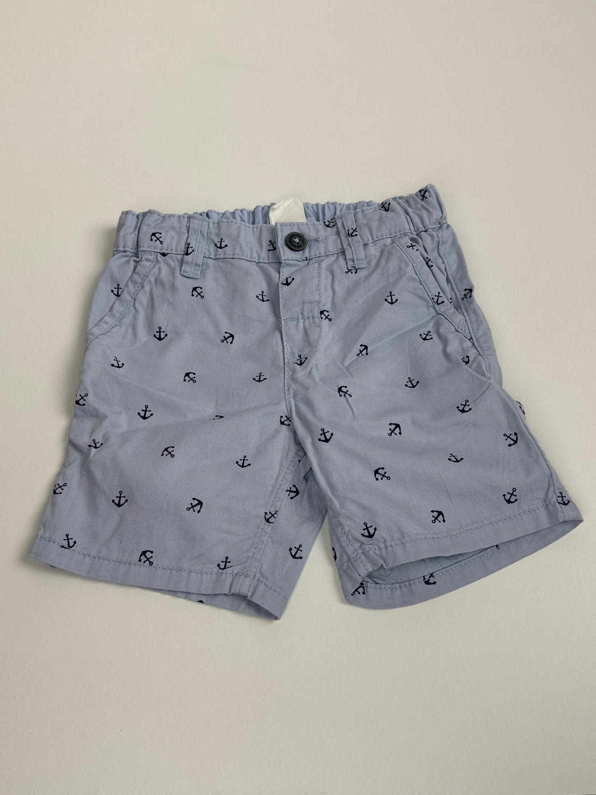 Máme tu chlapecké kraťasy H&M ve velikosti 68. Jsou světle šedé s jemným námořnickým vzorem kotviček v tmavě modré barvě. Ideální na léto, na dovolenou nebo na běžné nošení do školky i na hřiště. Díky pružnému pasu se pohodlně oblékají a dobře drží při pohybu.