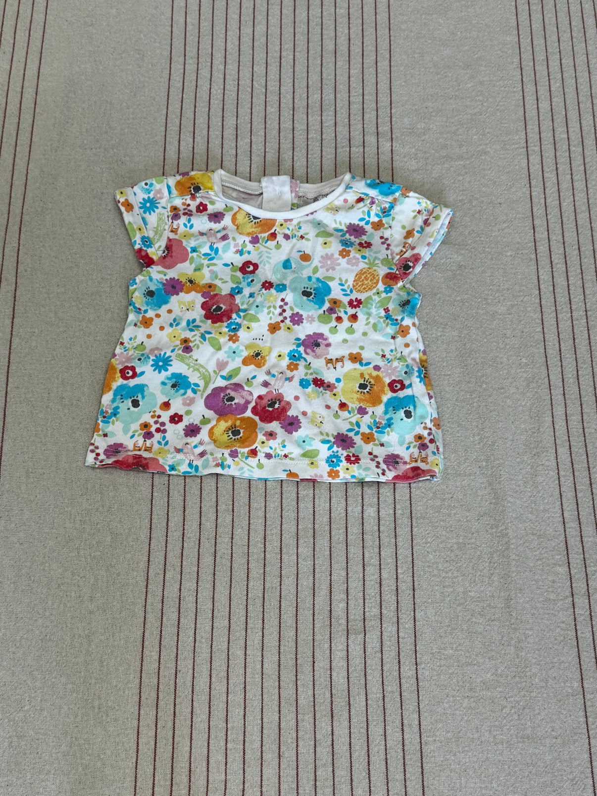 Roztomilé květované tričko s krátkým rukávem od značky F&F ve velikosti 56 cm. Toto tričko je zdobeno veselým potiskem barevných květin, což mu dodává hravý a svěží vzhled, ideální pro letní dny. Vyrobeno z měkkého a prodyšného materiálu, který zajišťuje pohodlí během nošení. Zapínání na zadní straně usnadňuje oblékání. Perfektní volba pro malé holčičky, ideální na procházky nebo jako stylový doplněk do každodenního šatníku.