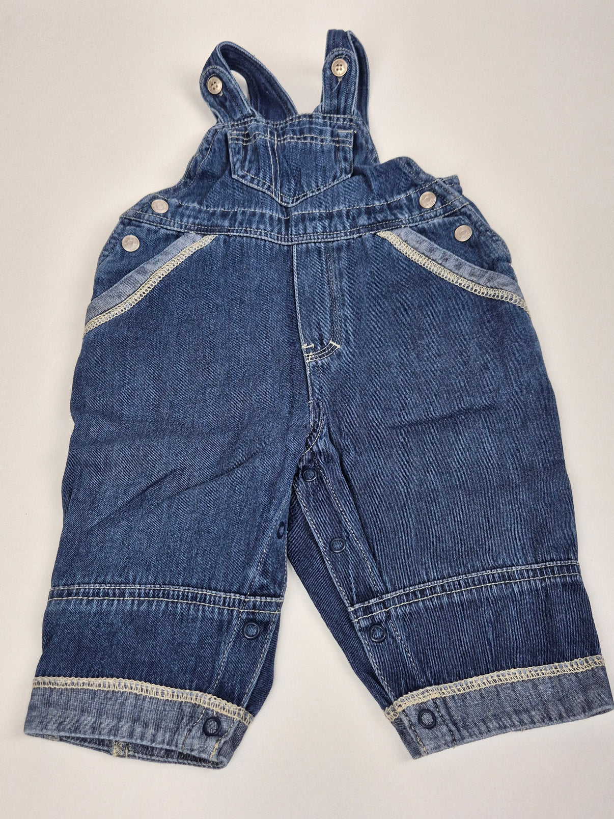 Roztomilé džínové laclové kalhoty H&M pro nejmenší. Klasický modrý denim s jemným opraným efektem působí ležérně, ale stále velmi roztomile. Kalhoty mají nastavitelné ramenní popruhy na knoflíky, postranní zapínání pro snadné oblékání a rozepínací vnitřní nohavice pro pohodlné přebalování. Na zadní straně jsou dvě kapsy a drobný dekorativní detail ve tvaru křížku.