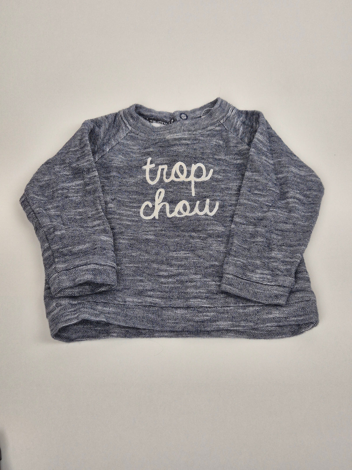 Lehká mikina Bou'tchou ve světle modrošedém melíru je ideální volbou na jaro i chladnější letní dny. Měkký a příjemný materiál zajistí pohodlí při nošení, praktické zapínání na rameni usnadní oblékání. Přední stranu zdobí vyšitý nápis trop chou – tedy „strašně roztomilý“, což tento kousek skvěle vystihuje.